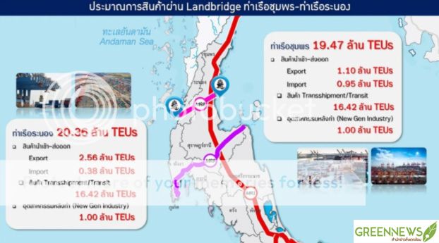 ตอนนี้ยังไม่มีการศึกษาออกแบบท่าเรือน้ำลึก แต่เส้นทาง Land Bridge อาจมีมอเตอร์เวย์ ทางรถไฟ และท่อขนส่งน้ำมัน เพื่อใช้ทั้งการขนส่งสินค้าและน้ำมันข้ามไปมาสองฝั่ง" ดร.ธรณ์ ธำรงนาวาสวัสดิ์ ผู้เชี่ยวชาญด้านนิเวศทางทะเล และรองคณบดี คณะประมง มหาวิทยาลัยเกษตรศาสตร์ โพสต์เฟสบุ๊กถึงความเคลื่อนไหวล่าสุดเกี่ยวกับทิศทางและแนวโน้มผลการศึกษา สำนักงานนโยบายและแผนการขนส่งและจราจร (สนข.)