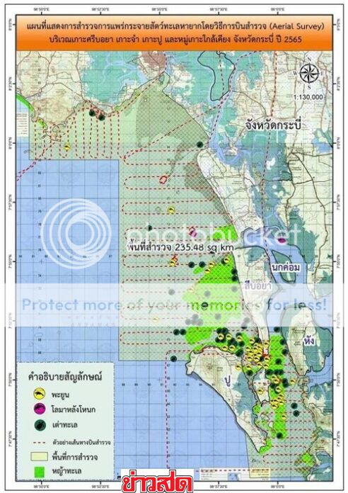 วันที่ 3 เม.ย.2565 นายอาหลี ชาญน้ำ นายกสมาคมคนรักเล จ.กระบี่ เปิดเผยว่า กรมทรัพยากรทางทะเลและชายฝั่ง ได้ทำการสำรวจสัตว์ทะเลหายากพื้นที่จ.กระบี่ โดยวิธีการบินสำรวจ (Aerial survey) เมื่อวันที่ 27 มี.ค. ? 1 เม.ย.2565 โดยศูนย์วิจัยทรัพยากรทางทะเลและชายฝั่งทะเลอันดามันตอนล่าง (ควอล.) ร่วมกับเจ้าหน้าที่ศูนย์วิจัยทรัพยากรทางทะเลและชายฝั่งอ่าวไทยตอนกลาง (ศวทก.)
