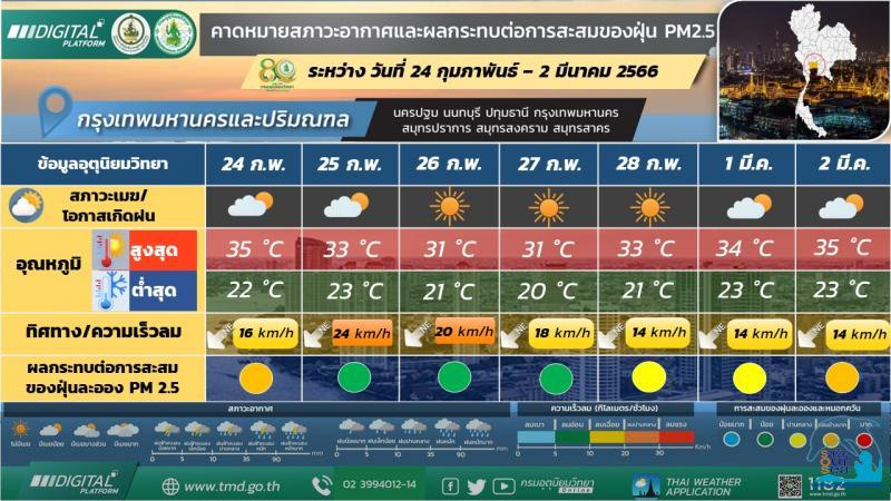 พยากรณ์อากาศ 24 ชั่วโมงข้างหน้า บริเวณความกดอากาศสูงกำลังปานกลางปกคลุมประเทศไทยตอนบน ในขณะที่มีลมฝ่ายตะวันตกในระดับบนพัดปกคลุมภาคเหนือ ทำให้ภาคเหนือมีอากาศเย็นถึงหนาว ส่วนภาคตะวันออกเฉียงเหนือ ภาคกลาง และภาคตะวันออกมีอากาศเย็นในตอนเช้า สำหรับมรสุมตะวันออกเฉียงเหนือและลมตะวันออกที่พัดปกคลุมอ่าวไทย ภาคใต้ และทะเลอันดามันมีกำลังอ่อน ทำให้ภาคใต้มีฝนน้อย ส่วนคลื่นลมบริเวณอ่าวไทยตอนล่างมีคลื่นสูง 1-2 เมตร บริเวณที่มีฝนฟ้าคะนองคลื่นสูงมากกว่า 2 เมตร อนึ่ง ในช่วงวันที่ 25-28 ก.พ. 66 บริเวณความกดอากาศสูงหรือมวลอากาศเย็นกำลังแรงจากประเทศจีนจะแผ่เสริมลงมาปกคลุมประเทศไทยตอนบนและทะเลจีนใต้ ทำให้ประเทศไทยตอนบนมีอากาศหนาวเย็นลง อุณหภูมิจะลดลง 2-5 องศาเซลเซียส กับมีลมแรง ขอให้ประชาชนในบริเวณดังกล่าวดูแลรักษาสุขภาพเนื่องจากสภาพอากาศที่หนาวเย็น รวมถึงอันตรายจากอัคคีภัยที่อาจจะเกิดขึ้นเนื่องจากสภาพอากาศแห้งในระยะนี้ ส่วนมรสุมตะวันออกเฉียงเหนือที่พัดปกคลุมอ่าวไทย ภาคใต้ และทะเลอันดามันจะมีกำลังแรงขึ้น ทำให้ภาคใต้ตอนล่างมีฝนเพิ่มขึ้นและมีฝนตกหนักบางแห่ง ส่วนคลื่นลมบริเวณอ่าวไทยมีกำลังแรง โดยมีคลื่นสูง 2-4 เมตร บริเวณที่มีฝนฟ้าคะนองคลื่นสูงมากกว่า 4 เมตร ส่วนทะเลอันดามันห่างฝั่งมีคลื่นสูง 1-2 เมตร ขอให้ประชาชนบริเวณภาคใต้ตอนล่างระวังอันตรายจากฝนตกหนักและฝนที่ตกสะสม ส่วนชาวเรือเดินเรือด้วยความระมัดระวัง และหลีกเลี่ยงบริเวณที่มีฝนฟ้าคะนอง ส่วนเรือเล็กบริเวณอ่าวไทยควรงดออกจากฝั่งในช่วงเวลาดังกล่าว รวมทั้งระวังอันตรายจากคลื่นลมแรงที่ซัดเข้าหาฝั่งไว้ด้วย