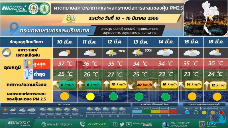 สภาวะอากาศทั่วไป พยากรณ์อากาศ 24 ชั่วโมงข้างหน้า บริเวณความกดอากาศสูงหรือมวลอากาศเย็นกำลังอ่อนปกคลุมภาคเหนือ ภาคตะวันออกเฉียงเหนือ และทะเลจีนใต้ ส่งผลทำให้มีลมตะวันออกและลมตะวันออกเฉียงใต้พัดปกคลุมประเทศไทยตอนบน ทำให้ประเทศไทยตอนบนมีหมอกบางในตอนเช้า และมีฝนเล็กน้อยบางแห่ง โดยมีอากาศร้อนกับฟ้าหลัวในตอนกลางวัน แต่ยังคงมีอากาศเย็นในตอนเช้าบริเวณภาคเหนือและภาคตะวันออกเฉียงเหนือ ขอให้ประชาชนในบริเวณดังกล่าวดูแลรักษาสุขภาพเนื่องจากสภาพอากาศที่เปลี่ยนแปลงในระยะนี้ไว้ด้วย สำหรับลมตะวันออกพัดปกคลุมอ่าวไทยและภาคใต้ ทำให้ภาคใต้มีฝนบางแห่งเกิดขึ้นได้ ส่วนคลื่นลมบริเวณอ่าวไทยตอนล่างมีคลื่นสูง 1-2 เมตร บริเวณที่มีฝนฟ้าคะนองคลื่นสูงมากกว่า 2 เมตร อนึ่ง ในช่วงวันที่ 12 - 14 มีนาคม 2566 บริเวณความกดอากาศสูงหรือมวลอากาศเย็นกำลังปานกลางจากประเทศจีนจะแผ่ลงมาปกคลุมประเทศไทยตอนบนและทะเลจีนใต้ ประกอบกับคลื่นกระแสลมฝ่ายตะวันตกจะเคลื่อนเข้าปกคลุมภาคเหนือ ในขณะที่ประเทศไทยมีอากาศร้อน ลักษณะเช่นนี้จะทำให้ภาคเหนือ ภาคตะวันออกเฉียงเหนือ ภาคกลาง ภาคตะวันออก รวมทั้งกรุงเทพมหานครและปริมณฑลมีพายุฤดูร้อนเกิดขึ้น ฝุ่นละอองในระยะนี้: ประเทศไทยตอนบนมีแนวโน้มการสะสมฝุ่นละออง/หมอกควันมาก เนื่องจากลมที่พัดปกคลุมมีกำลังอ่อนและการระบายอากาศไม่ดี กรุงเทพมหานครและปริมณฑล มีหมอกบางในตอนเช้า และมีอากาศร้อนกับฟ้าหลัวในตอนกลางวัน โดยมีฝนเล็กน้อยบางแห่ง อุณหภูมิต่ำสุด 25-26 องศาเซลเซียส อุณหภูมิสูงสุด 34-37 องศาเซลเซียส ลมตะวันออกเฉียงใต้ ความเร็ว 10-15 กม./ชม. คาดหมาย ในช่วงวันที่ 9 ? 11 มี.ค. 66 และวันที่ 15 มี.ค. 66 บริเวณความกดอากาศสูงหรือมวลอากาศเย็นกำลังอ่อนปกคลุมประเทศไทยตอนบนและทะเลจีนใต้ ส่งผลทำให้มีลมตะวันออกและลมตะวันออกเฉียงใต้พัดเข้ามาปกคลุมประเทศไทยตอนบน ลักษณะเช่นนี้ทำให้บริเวณดังกล่าวมีหมอกบางในตอนเช้ากับอากาศร้อนในตอนกลางวัน แต่ยังคงมีอากาศเย็นในตอนเช้าบริเวณภาคเหนือและภาคตะวันออกเฉียงเหนือ ส่วนในช่วงวันที่ 12 ? 14 มี.ค. 66 บริเวณกดอากาศสูงหรือมวลอากาศเย็นกำลังปานกลางอีกระลอกหนึ่งจากประเทศจีนจะแผ่ปกคลุมภาคประเทศไทยตอนบน และทะเลจีนใต้ โดยมีลมตะวันออกและลมตะวันออกเฉียงใต้พัดเข้ามาปกคลุมภาคเหนือ ภาคกลาง และภาคตะวันออก ประกอบกับคลื่นกระแสลมฝ่ายตะวันตกจะเคลื่อนเข้าปกคลุมภาคเหนือ ในขณะที่ประเทศไทยตอนบนมีอากาศร้อน ทำให้บริเวณดังกล่าวมีพายุฤดูร้อนเกิดขึ้น โดยมีลักษณะของพายุฝนฟ้าคะนอง ลมกระโชกแรง แ