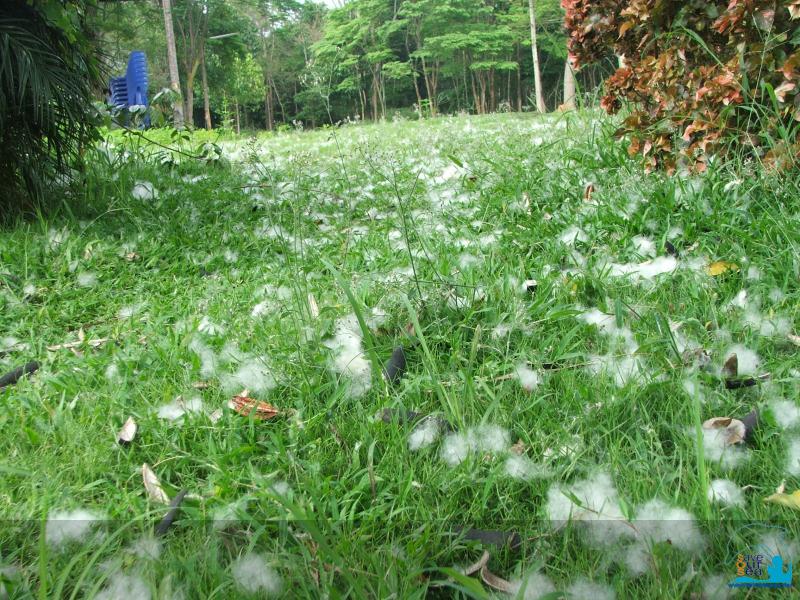 วันนี้ฝักของต้นนุ่นหน้าที่ทำการแตกพอดีครับพื้นที่รอบๆต้นไม้เลยกลายมีสีขาวเป็นหย่อมๆ