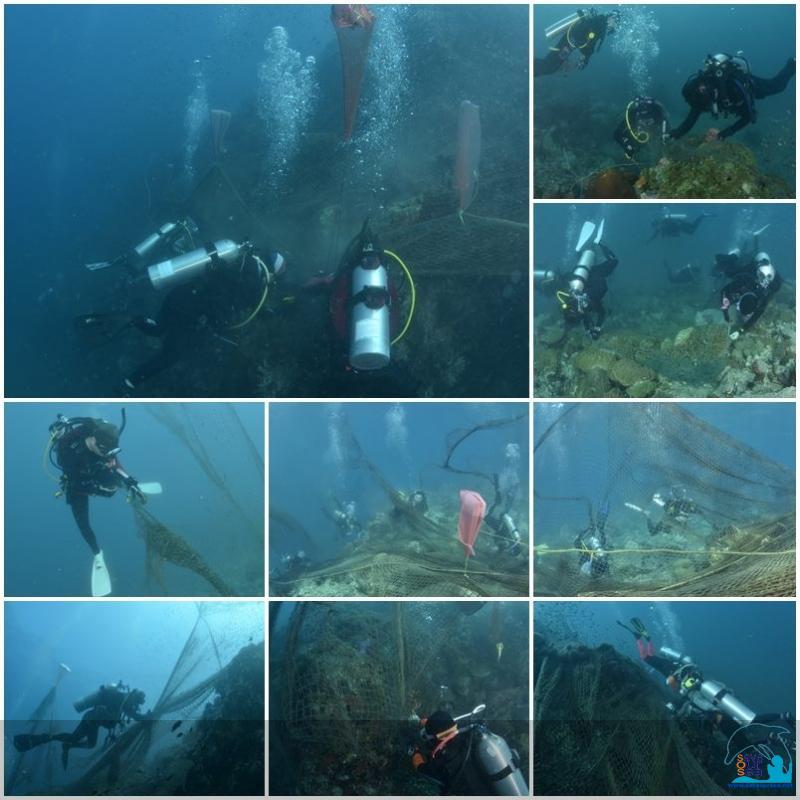 ไม่ต้องพูดพล่ามทำเพลง เพราะช้าไม่ได้แล้ว...เราเริ่มลงมือทำงานกันทันที เริ่มด้วยการใช้ถุงก๊อบแก๊บที่ใช้แทนถุงยก (Lift Bag) ผูกอวนเป็นช่วงๆ เพื่อให้อวนยกขึ้นเล็กน้อย ทำให้การตัดอวนง่ายขึ้น และยกอวนให้พ้นแนวปะการัง (แต่ไม่รั้งจนดึงปะการังจนแตกหักเสียหาย)