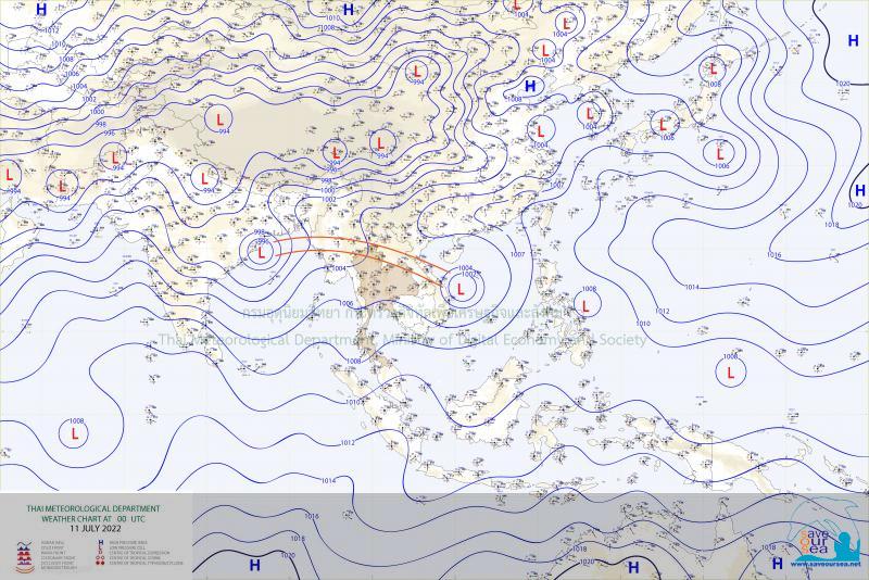 สภาวะอากาศทั่วไป พยากรณ์อากาศ 24 ชั่วโมงข้างหน้า มรสุมตะวันตกเฉียงใต้กำลังแรงพัดปกคลุมทะเลอันดามัน ประเทศไทย และอ่าวไทย ประกอบกับร่องมรสุมพาดผ่านประเทศเมียนมา ตอนบนของภาคเหนือและภาคตะวันออกเฉียงเหนือของประเทศไทย ประเทศลาวตอนบน เข้าสู่หย่อมความกดอากาศต่ำกำลังแรงบริเวณทะเลจีนใต้ตอนบน ลักษณะเช่นนี้ทำให้ภาคเหนือ ภาคตะวันออกเฉียงเหนือ ภาคกลาง ภาคตะวันออก และภาคใต้ มีฝนตกหนักถึงหนักมากบางแห่ง ขอให้ประชาชนบริเวณดังกล่าวระวังอันตรายจากฝนตกหนักถึงหนักมากและฝนที่ตกสะสมซึ่งอาจทำให้เกิดน้ำท่วมฉับพลันและน้ำป่าไหลหลากในระยะนี้ สำหรับคลื่นลมบริเวณทะเลอันดามันและอ่าวไทยมีกำลังแรง โดยทะเลอันดามันตอนบนมีคลื่นสูง 2-3 เมตร บริเวณที่มีฝนฟ้าคะนองมีคลื่นสูงมากกว่า 3 เมตร บริเวณทะเลอันดามันตอนล่างและอ่าวไทยตอนบนมีคลื่นสูงประมาณ 2 เมตร บริเวณที่มีฝนฟ้าคะนองมีคลื่นสูงมากกว่า 2 เมตร ส่วนอ่าวไทยตอนล่างทะเลมีคลื่นสูง 1-2 เมตร บริเวณที่มีฝนฟ้าคะนองมีคลื่นสูงประมาณ 2 เมตร ขอให้ชาวเรือในบริเวณดังกล่าวเดินเรือด้วยความระมัดระวังและหลีกเลี่ยงการเดินเรือบริเวณที่มีฝนฟ้าคะนอง เรือเล็กบริเวณทะเลอันดามันตอนบนควรงดออกจากฝั่งในช่วงวันที่ 11?14 ก.ค. 65 ไว้ด้วย กรุงเทพมหานครและปริมณฑล มีฝนฟ้าคะนองร้อยละ 60 ของพื้นที่ กับมีฝนตกหนักบางแห่ง อุณหภูมิต่ำสุด 25-27 องศาเซลเซียส อุณหภูมิสูงสุด 32-35 องศาเซลเซียส ลมตะวันตกเฉียงใต้ ความเร็ว 10-20 กม./ชม. คาดหมาย ในช่วงวันที่ 10 ? 14 ก.ค. 65 มรสุมตะวันตกเฉียงใต้ที่พัดปกคลุมทะเลอันดามัน ประเทศไทย และอ่าวไทยมีกำลังแรง ประกอบกับร่องมรสุมจะเลื่อนลงมาพาดผ่านภาคเหนือ ภาคตะวันออกเฉียงเหนือ เข้าสู่หย่อมความกดอากาศต่ำกำลังแรงบริเวณทะเลจีนใต้ตอนบน ทำให้ประเทศไทยจะมีฝนเพิ่มขึ้น โดยมีฝนตกหนักถึงหนักมากบางแห่งบริเวณภาคเหนือ ภาคตะวันออกเฉียงเหนือ ภาคกลาง รวมทั้งกรุงเทพมหานครและปริมณฑล ภาคตะวันออก และภาคใต้ สำหรับคลื่นลมบริเวณทะเลอันดามันและอ่าวไทยตอนบนมีกำลังแรง โดยบริเวณทะเลอันดามันตอนบนมีคลื่นสูง 2-4 เมตร บริเวณที่มีฝนฟ้าคะนองมีคลื่นสูงมากกว่า 4 เมตร บริเวณทะเลอันดามันตอนล่างและอ่าวไทยตอนบนมีคลื่นสูง 2-3 เมตร บริเวณที่มีฝนฟ้าคะนองมีคลื่นสูงมากกว่า 3 เมตร ส่วนอ่าวไทยตอนล่างทะเลมีคลื่นสูงประมาณ 2 เมตร บริเวณที่มีฝนฟ้าคะนองมีคลื่นสูงมากกว่า 2 เมตร ในช่วงวันที่ 15 ? 16 ก.ค. 65 มรสุมตะวันตกเฉียงใต้ที่พัดปกคลุมทะเลอันดามัน ประเทศไทย และอ่าวไทยจะมีกำลังอ่อนลง แต่ยังคงทำให้ประเทศไทยมีฝนตกหนักบางแห่งบริ