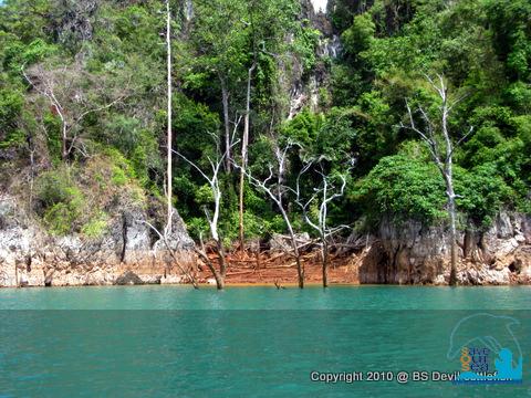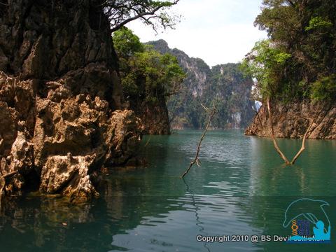 ล่องเข้าไปในบริเวณเก็บกักน้ำ ที่รายล้อมด้วยเขาหินปูน และน้ำที่เขียวมรกต