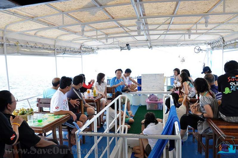 สมาชิกบนเรือให้ความสนใจฟังอย่างคับคั่ง รวมทั้งเด็กลูกเรือด้วย