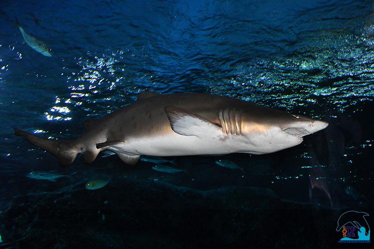 ที่ดูน่าเกรงขามสำหรับสองสายเห็นจะเป็น เจ้าฉลามเสือทรายหนุ่มฟ้อหล่อเฟี้ยว ตัวบักเอ้กตัวนี้ .... แอบถ่ายเครื่องเพศเอาไว้ดูเล่นด้วย ดูภาพที่สาม แล้วลองนึกสิครับ ..... ถ้าลง Night Dive พอฉายไฟขึ้นไปด้านบน เจอพี่ตัวนี้โผล่จากความมืดมาจ๊ะเอ๋อย่างในภาพ จะรู้สึกยังไง