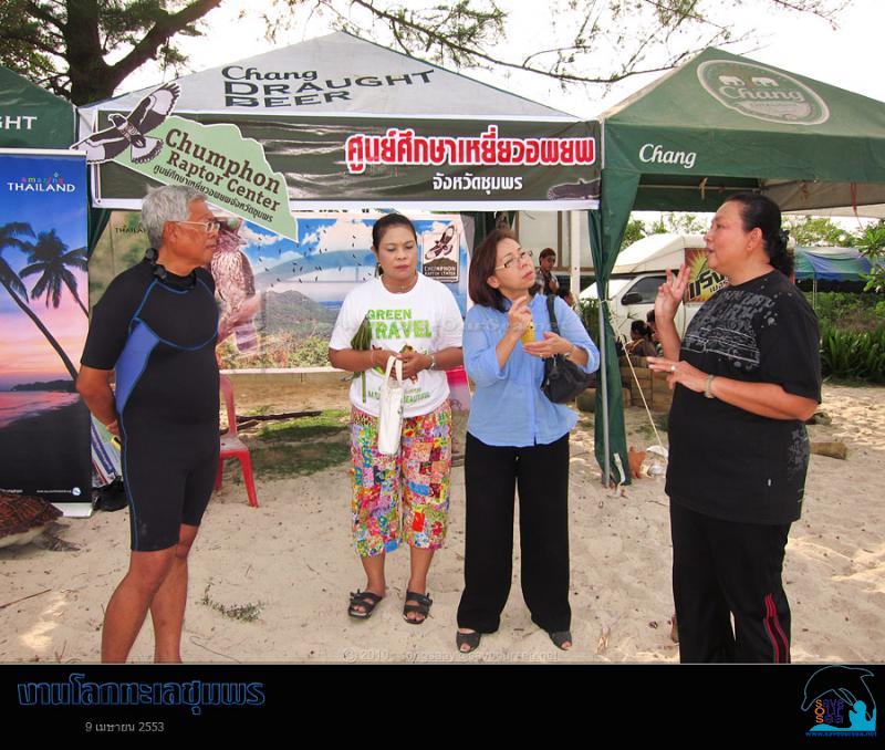 ตามที่ได้แจ้งให้ทราบในรายละเอียดไว้ในกระทู้โครงการ "งานโลกทะเลชุมพร 2010 ... Save Our Future Save Our Sea" ในลิ๊งค์ http://www.saveoursea.net/forums/showthread.php?t=825 จะจัดให้มีขึ้นในวันที่ 10 - 12 เมษายน 2553 โดยสองสายเองได้รับเชิญให้เป็นที่ปรึกษาด้านกิจกรรมทางทะเล (ดำน้ำ-ปล่อยหอย-ปล่อยปลา-เก็บขยะ/ตัดอวน) แก่ท่านผู้ว่าราชการจังหวัดชุมพร (ในขณะนั้น) นายการัณย์ ศุภกิจวิเลขการ และคณะกรรมการจัดงาน เนื่องจากการทำกิจกรรมดังกล่าว ต้องใช้อาสาสมัครที่มีประสบการณ์ในการดำน้ำทำกิจกรรมที่กล่าวถึงมาแล้ว สองสายจึงมาประกาศรับสมัครสมาชิก SOS และได้สมาชิกที่สมัครไปร่วมงานทั้งแบบค้างคืนและแบบไปเช้าเย็นกลับจำนวน 9 คน และกลุ่มแม่หอยกับน้าหอยอีก 4 คน นอกนั้น เป็นอาสาสมัครที่ทางชุมพรเป็นผู้รับสมัครเอง ตัวสองสายเองได้เดินทางล่วงหน้าไปตั้งแต่วันที่ 9 เมษายน เพื่อไปปรึกษาหารือเพิ่มเติมเพื่อเตรียมความพร้อมสำหรับงานในวันรุ่งขึ้น และดูสถานที่จัดงาน สถานที่จัดงานและเวทีถูกตั้งขึ้นบนหาดทุ่งวัวแล่นทางด้านเหนือ ไม่ใช่ด้านใต้หน้าชุมพรคาบาน่าที่พวกเราคุ้นเคยกันดี