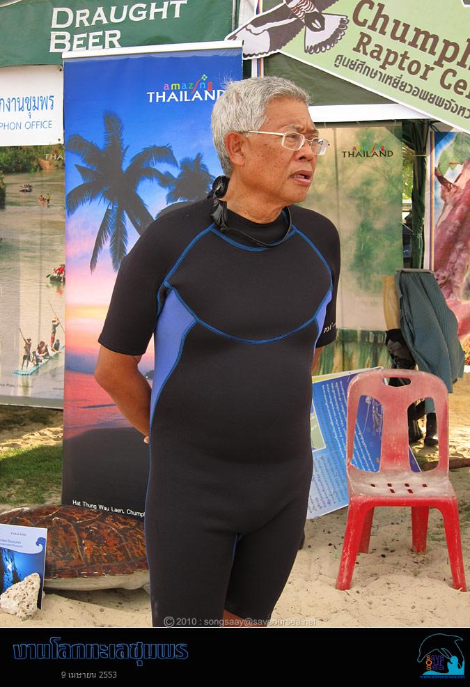 เมื่อสองสายไปถึงได้พบคุณเล็ก หรือ คุณสุวรรณี ธรรมวุฒิ นายกสมาคมท่องเที่ยวจังหวัดชุมพร ที่ทำหน้าที่เลขานุการคณะกรรมการจัดงานฯ จึงได้ยืนปรึกษาเรื่องกิจกรรมกัน สักครู่เดียว ท่านผู้ว่าฯ การัณย์ในชุด Wetsuit แบบ Shorty ได้เข้ามาสมทบร่วมวงสนทนา .... อาจจะสงสัยว่าทำไมท่านผู้ว่าฯต้องใส่ Shorty เป็นเพราะท่านเป็นนักว่ายน้ำ จะมาออกกำลังกายด้วยการว่ายน้ำในทะเลที่หน้าหาดทุ่งวัวแล่นเป็นประจำทุกเย็นหลังเวลาราชการ