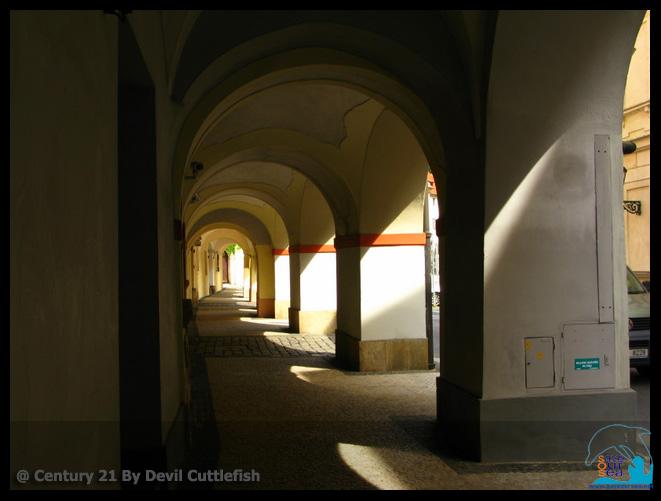 ระหว่างตัวตึกเอง ก็มีทางเชื่อม ซึ่งก็ไม่ธรรมดาอีก ภาพขาว-ดำ ก็ยังมีมนต์ขลังเหมือนเดิม