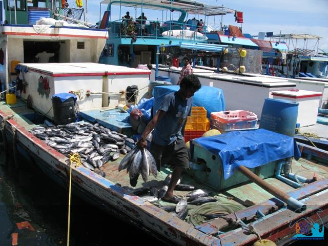 มัลดีฟส์ส่งออกปลาทูน่า ในตลาดแห่งนี้จึงมีปลาทูน่าหลากหลายขนาด พร้อมมือชำแหละพันศพประจำการรอรับคำสั่งซื้อจากลูกค้า |