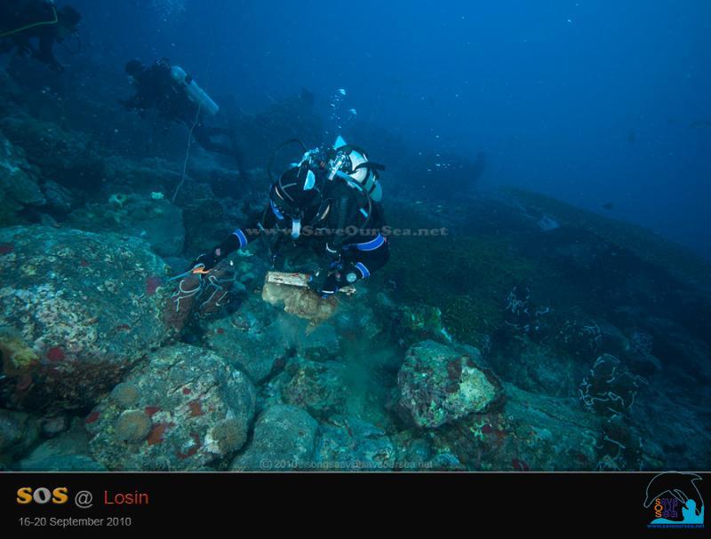 มาครั้งนี้ จึงตั้งใจกันแน่วแน่ที่จะเอากลับขึ้นไปให้ได้ เราไปพบมันกองอยู่บนพื้นทรายด้านใต้ของกองหินกองเล็ก มีฟองน้ำเกาะอยู่บ้าง แต่น้ำลึกพอดู พอพบเข้า พี่ๆน้องๆไม่พูดพล่ามทำเพลง ตรงเข้าลุยทันที โดยเฉพาะน้อง Blue Day ที่กินอากาศไม่จุเหมือนเดิมแล้ว สามารถช่วยทำงานได้เต็มที่โดยไม่ต้องหนีขึ้นเรือก่อนอย่างที่เคยทำ