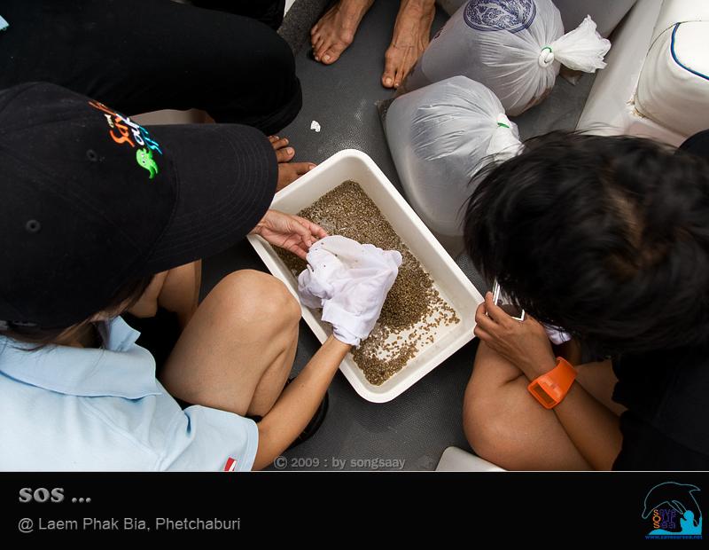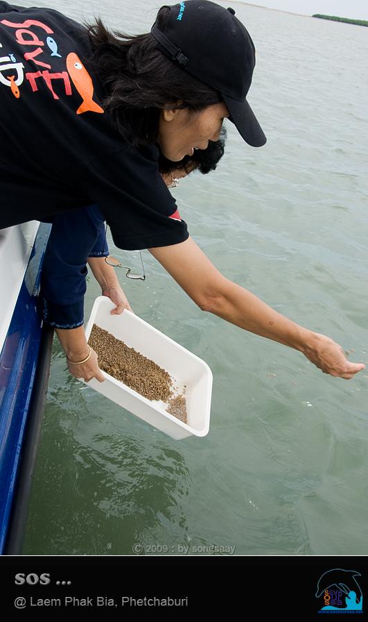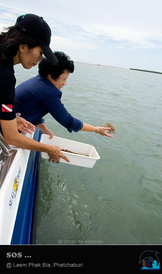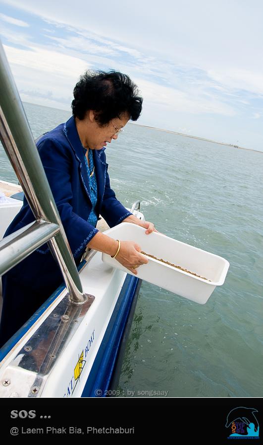 ส่วนลูกหอยแครงนั้น ต้องลงเรือออกไปปล่อยแถวปลายแหลมผักเบี้ย ซึ่งแต่ละกลุ่มส่งได้เพียงตัวแทนลงเรือสปีดโบ๊ตลำเล็กๆออกไปปล่อยเท่านั้น คุณสายน้ำช่างได้รับเกียรติแบบหายใจหายคอไม่ทัน ให้เป็นตัวแทน SOS ลงเรือไปกับแม่หอยและ ผอ.สุภัทราด้วย โดยมีน้องแมลงปอ ที่ขี้เมาพอกัน กับน้อง Oo และ น้อง hs4opb ตามขึ้นเรือมาด้วยกัน โดยมีพี่ๆน้องๆยืนส่งด้วยใบหน้ายิ้มแย้ม