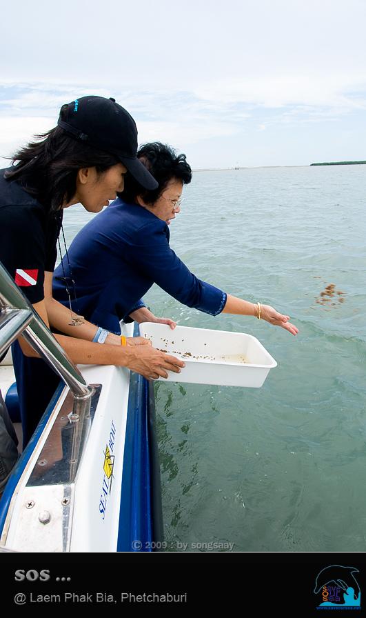..... แล้วก็ ปล่อยปูกันเลย โดยคุณสายชล จาก sos และคุณสุภัทรา อุไรวรรณ์ ผู้อำนวยการสถาบันวิจัยและพัฒนาพันธุกรรมสัตว์น้ำ กรมประมง (หัวหน้าของคุณธเนศ) เป็นประธานในการปล่อย โดยที่คุณธเนศ (ใส่เสื้อสีฟ้า สวมหมวก SOS) ยืนให้กำลังใจอยู่ด้านข้าง
