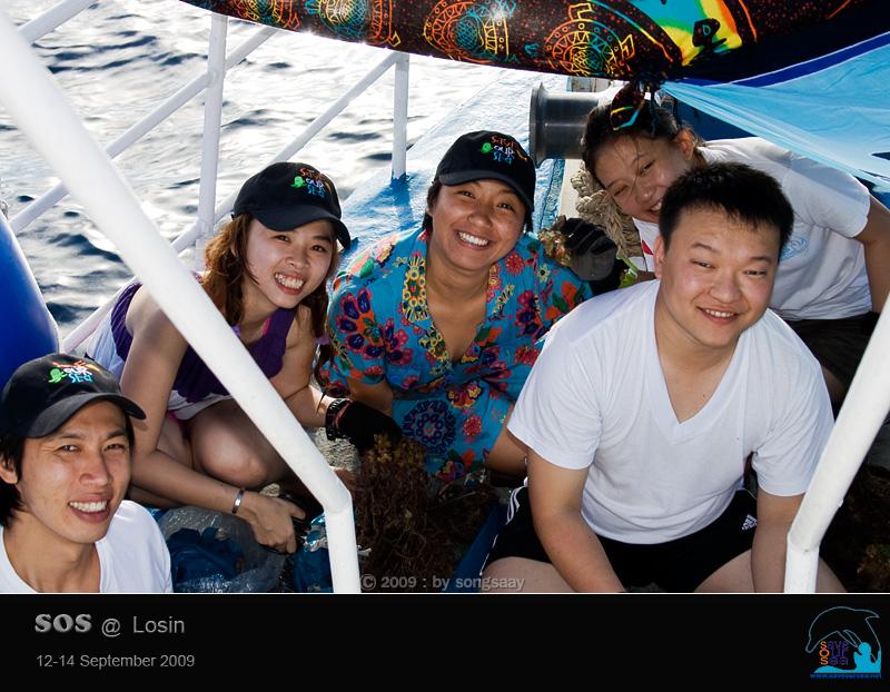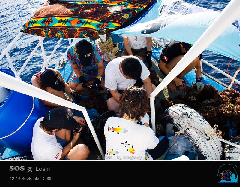 การดำน้ำตัดอวนว่าเหนื่อยแล้ว แต่การมานั่งเลาะเศษปะการังออกจากอวนที่หัวเรือ เหนื่อยยิ่งกว่า มีทั้งภาคกลางวัน ....
