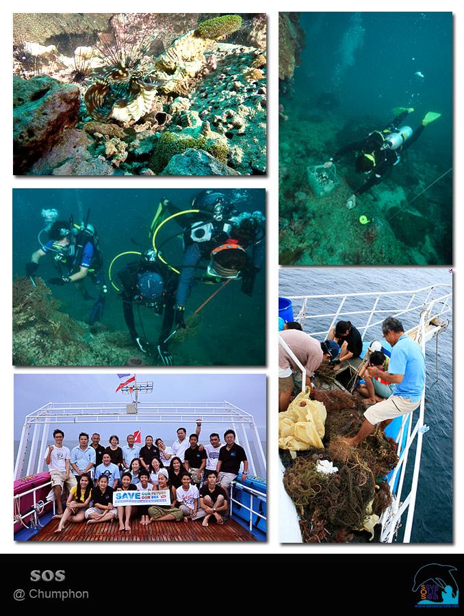 นอกจากนี้....เรายังพบว่าใต้ทะเลบริเวณจุดดำน้ำหลายๆจุดในเขต จ.ชุมพร มีเศษอวนขนาดใหญ่ปกคลุมกองหินใต้น้ำ และบางส่วนลอยขึ้นสูงเกือบถึงผิวน้ำ นอจากนี้ ยังได้พบเศษอวนขนาดเล็กๆและชนิดที่เป็นเอ็นใสอีกเป็นจำนวนมาก ซึ่งเศษอวนทั้งหมดนี้ อาจจะเป็นอุปสรรคในการเดินเรือ เป็นอันตรายต่อชีวิตนักดำน้ำ และเป็นอันตรายต่อสัตว์ที่ผ่านไปมาในบริเวณนั้นได้