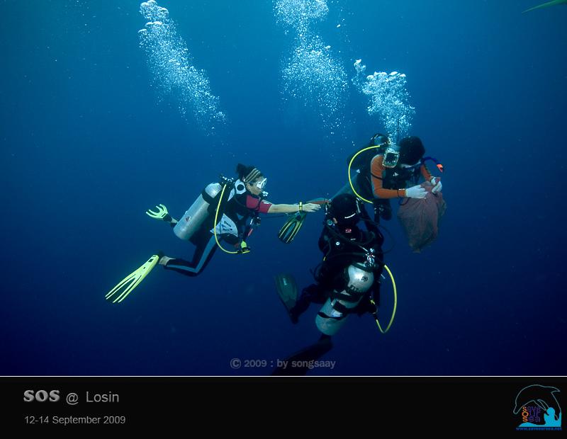 โลซินด้านตะวันออก เป้าหมายต่อไปสำหรับกิจกรรมตัดอวนที่อยู่ใต้น้ำรอบๆกองหินโลซิน ของพวกเราชาว sos ก็คือแนวปะการังด้านตะวันออก ซึ่งเมื่อเดือนพฤษภาคม สองสายได้เห็นอวนผืนใหญ่คลุมอยู่ เมื่อเรากระโดดลงไปบริเวณด้านตะวันออกของประภาคาร เราก็ได้เห็นอวนผืนใหญ่ยังคลุมแนวปะการังด้านนี้เป็นแนวยาว ไม่พูดพล่ามทำเพลง....พวกเราตรงดิ่งเข้าไปทะเลาะกับอวนทันที...