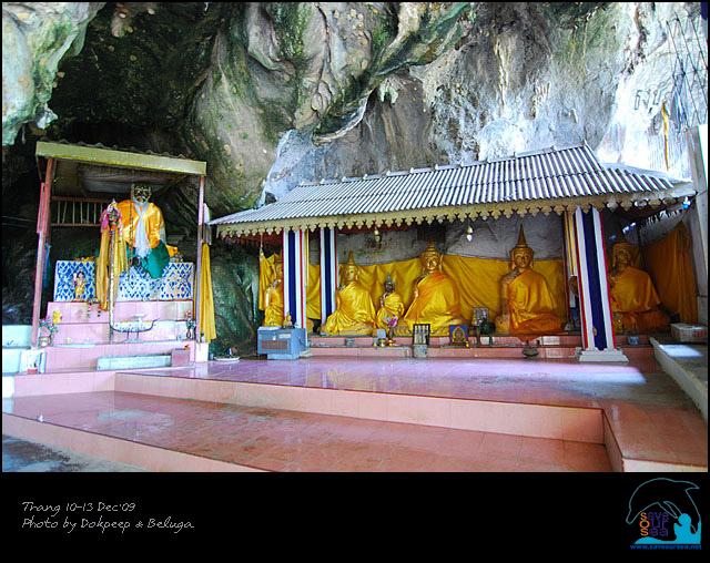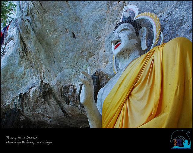 ปากถ้ำติดหน้าผาด้านบน ใกล้พระพุทธรูปเก่าแก่สีขาว มีพระปรมาภิไธยย่อของพระเจ้าอยู่หัวรััชกาลที่ 7 สลักไว้บนหน้าผา บรรยากาศด้านล่างให้ต้นไม้และภูเขาเขียวขจี