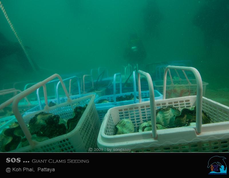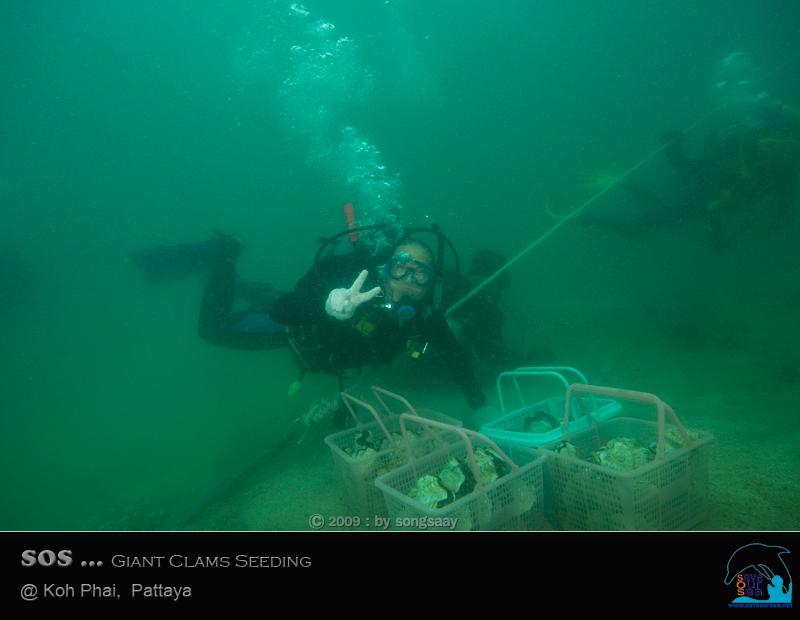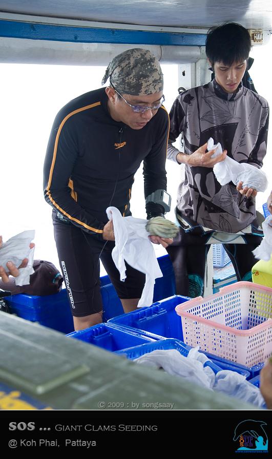 เราแบ่งกลุ่มดำน้ำออกเป็น 4 กลุ่ม....กลุ่มละ 6 คน แต่ละกลุ่มช่วยกันขนตะกร้าใส่หอยมือเสือลงไปวาง ที่ใต้ท้องทะเลบริเวณสมอเรือ.... น้องดู๋ซึ่งดำน้ำเก่งแล้ว ดำน้ำขึ้นๆลงๆรับตะกร้าหอยมาวางเรียงไว้อย่างเรียบร้อย....