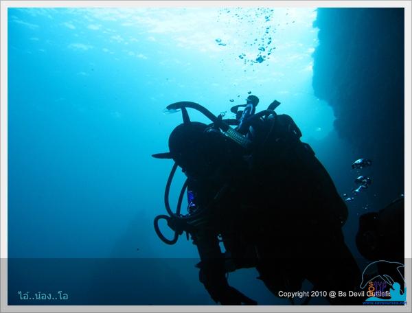 หินแดง - ไดร์นี้พวกเราเก็บเศษอวนที่ด้านใต้-ตะวันตก บริเวณหัวแหลม ได้เยอะพอควร น่าเสียดาย ที่ไม่เห็นปลาใหญ่ เลย แต่ อย่างไรก็ตาม หินแดง ก็สวยเหมือนเดิม หินม่วง - เริ่มภารกิจ หา Rhinophias ไปตามที่น้องติ่ง บอกเด๊ะ เลย วนไปก่อน 1 รอบ เอ๊ะ ไม่เจอแฮะ อ้าววนกลับมารอบสอง ดำแบบซิกแซก และสายตา ก็ไปสะดุด พี่รูปหล่อตัวเบ้อเร่อเลย ช่ายยยย เห็นเด่นสะดุดตา จริงๆ ด้วยหากไปถูกทิศ ไม่น่าหลงทิศตั้งแต่แรกเลย ฮิฮิ เชื่อมะ Leader ก็พลาดได้ หุ หุ หุ หินม่วง - ห้าใหญ่ -