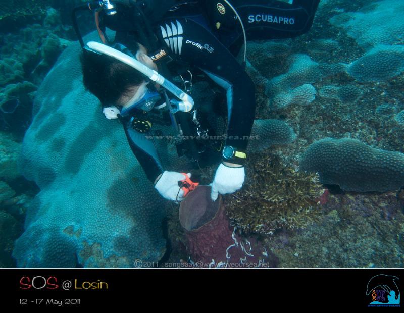 กองหินโลซินด้านตะวันออก...ตะวันตก...และเหนือ เช้าวันที่สอง (15 พฤษภาคม 2554)...เราตื่นกันแต่เช้าเช่นเคย ยังไม่ถึงแปดโมงเช้าดี เราก็พร้อมจะลงดำน้ำกันที่ด้านตะวันตกของกองหินโผล่ เพื่อจัดการกับอวนที่ยังตัดและนำขึ้นไม่หมด เกิดความผิดพลาดของกัปตัน หรือผู้ไปบอกกัปตันก็ไม่ทราบได้ แทนที่เรือจะนำเราไปลงน้ำทางด้านตะวันตก เพื่อไปยังจุดที่อวนกองอยู่ กลับไปส่งเราลงทางด้านตะวันออก อย่างไรก็ตาม...ทีมดำน้ำนำโดยน้องหนึ่ง น้องแก่น และน้องติ่ง ก็ข้ามสันหินไปถึงกองอวน ที่อยู่ทางทิศตะวันตกเฉียงใต้ของกองหิน และจัดการตัดและส่งอวนขึ้นสู่ผิวน้ำได้สำเร็จ ส่วนทีมที่เหลือ คือทีมของน้องติ๊ก ข้ามสันหินไปทางตะวันตกได้แล้ว ก็ตีฟินต้านน้ำขึ้นเหนือไปฉิวๆ สองสายก็เลยตามน้องติ๊กไปเรื่อยๆ แม้ไม่ได้ตัดอวนกองโต เราก็ได้เก็บเศษอวนและสายเบ็ดไปตลอดทาง...