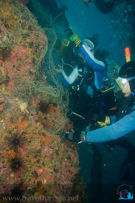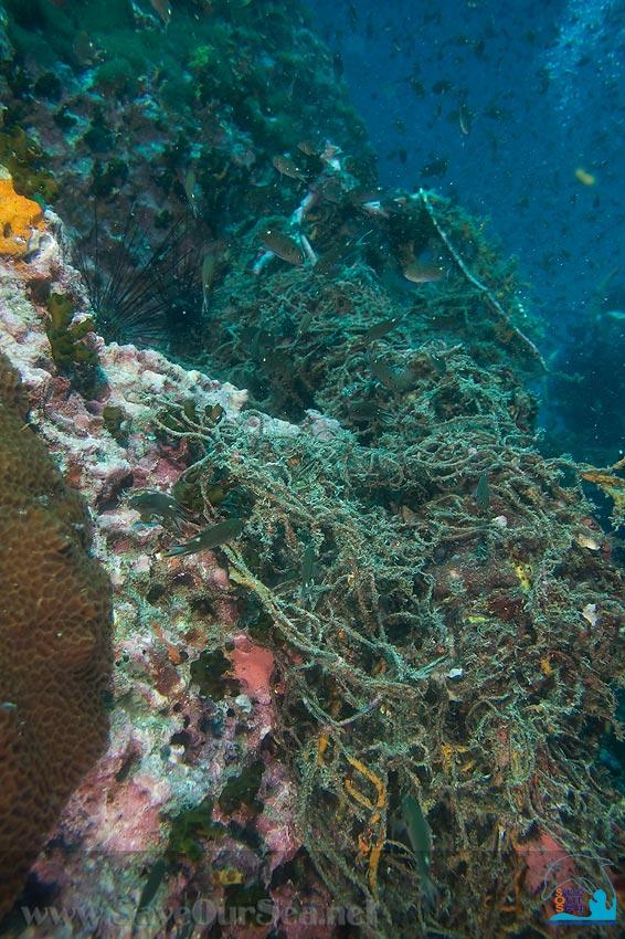 และแล้ว ที่ใกล้ความลึกประมาณ 90-100 ฟุต เราก็พบเศษอวนผืนใหญ่ที่ยังคงแผ่กว้างอยู่ด้านข้างของกองหิน