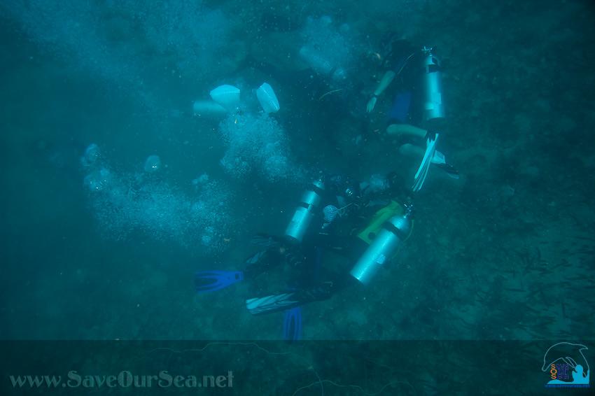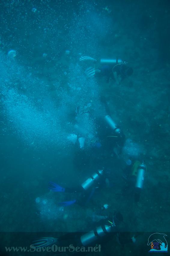 เมื่อว่ายเลยไปด้านเหนือของกองหิน.....มองลงไปด้านล่างที่ประมาณ 90 ฟุต เห็นความชุลมุนของกลุ่ม 4 ที่พยายามเก็บเศษอวนแข่งกับเวลา