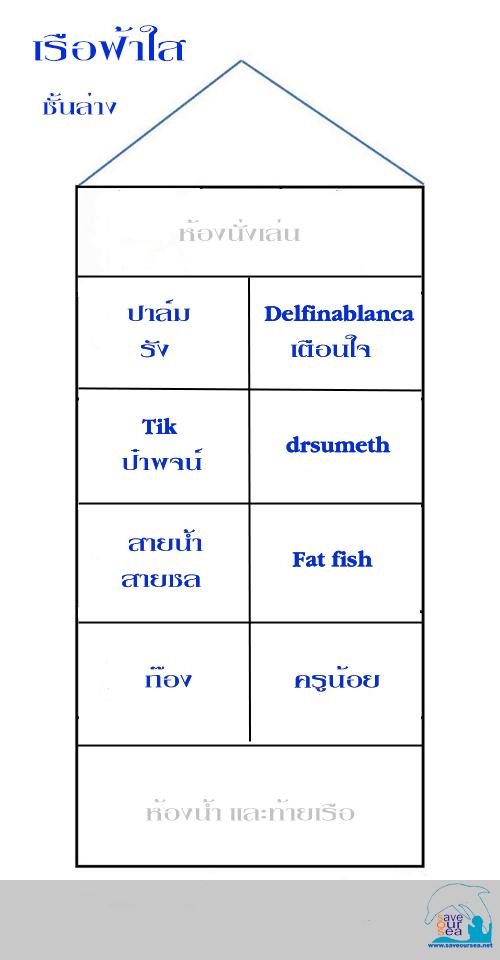 ส่วน ห้องนอน ... เนื่องจากคนไม่เต็ม ผมจึงแยกพวกกล้องใหญ่ 3 คนไว้นอนเดี่ยว ชั้นล่าง คือ Fat fish, Tatchai และ drsumeth ซึ่งถ้าเจ้าหน้าที่อุทยานฯจะมาพักด้วย ก็คงเติมเข้าไปใน 3 ห้องนี้ และได้จัดไว้ดังนี้ครับ