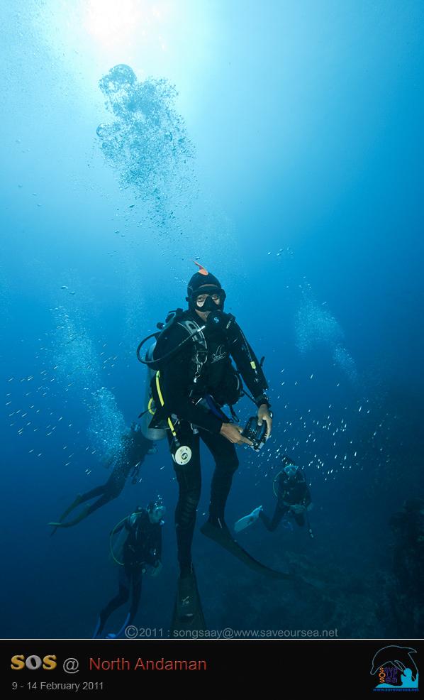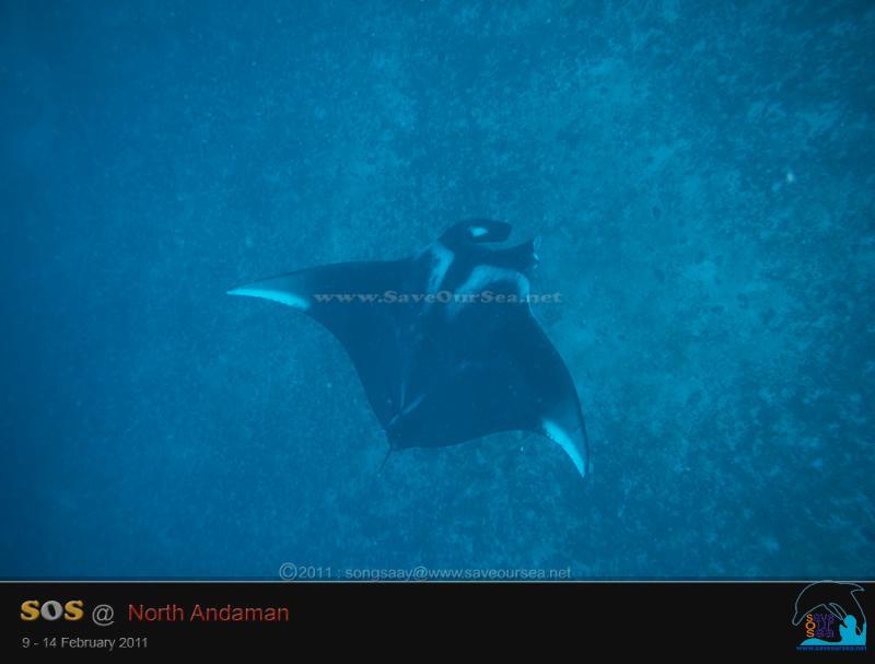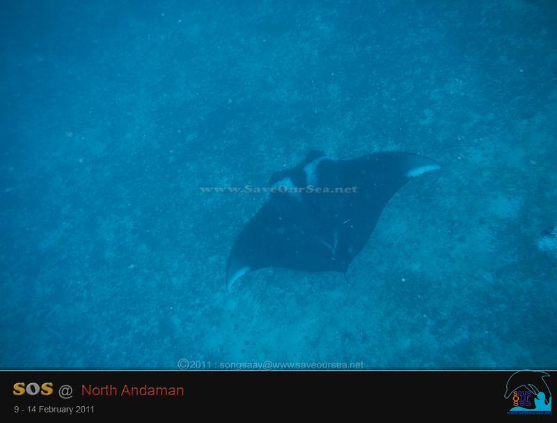 กำลังมองดูนู่นนี่นั่นอยู่...คุณสายน้ำก็ส่งเสียงอู้วๆเรียก และชี้มือให้ดูกระเบนราหูที่โฉบผ่านมา พอมีคนไปดักหน้า เขาก็ว่ายดิ่งลงไปเบื้องล่าง ลึกกว่า 40 เมตร มีนักดำน้ำคนหนึ่ง ยังว่ายไล่กวดกระเบนราหูไปติดๆ.....จนกระเบนราหู กระพือปีกว่ายหนีไปจนลับตา....