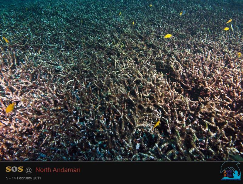 เลยจากปะการังโขดรูปเห็ดไปไม่ไกลนัก เคยเป็นแนวปะการังเขากวางที่ขึ้นแน่นเหมือนทุ่ง และเป็นที่อาศัยของปลาสวยงามในแนวปะการังมากมายหลายชนิด เมื่อมองอยู่ห่างๆ เรายังเห็นแนวปะการังเขากวางอยู่ แต่ผิดสังเกตตรงที่ปลาในแนวปะการังเล็กๆ เช่น ปลาสลิดหิน (Damselfish) ปลากะรังจิ๋ว (Basslets) ลดน้อยไปมาก และเมื่อเข้าไปใกล้ ก็ทำให้ตกใจ..... เพราะดงปะการังเขากวางทั้งหมด ได้แห้งตาย และมีสาหร่ายจับตามกิ่งปะการังเต็มไปหมดแล้ว เห็นแล้วอยากจะร้องไห้....