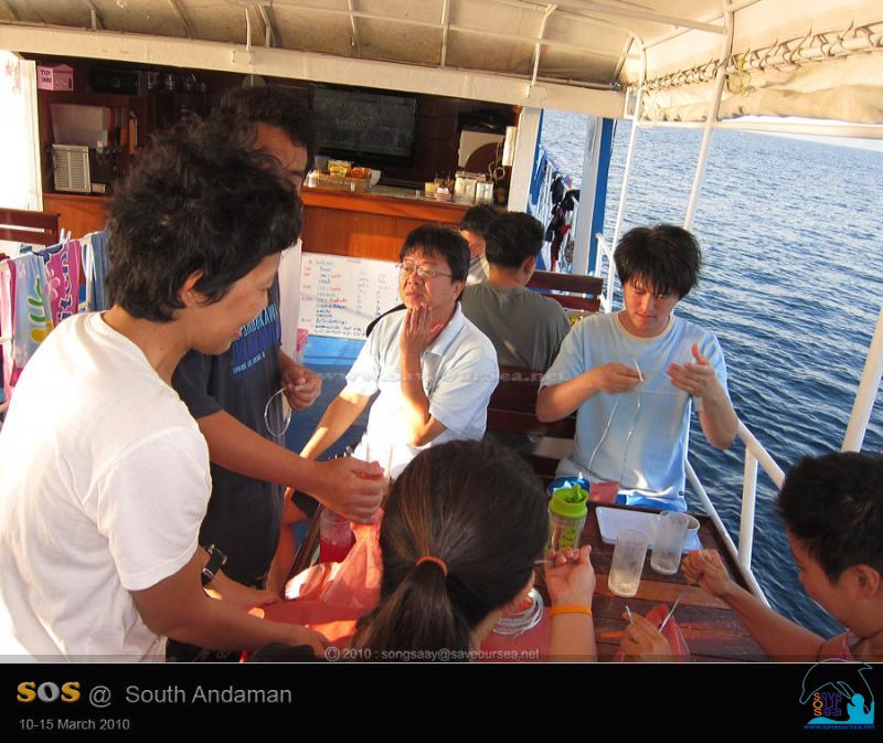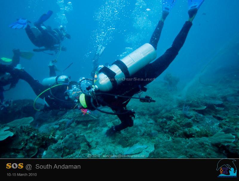 ดูมาตราวัดน้ำขึ้นน้ำลงก่อนลงน้ำบอกว่า น้ำขึ้น ความแรงประมาณ 4 เด ตามนั้นเลยครับ น้ำแรงใช้ได้ ...... แต่พอลงน้ำกันไป แค่สู้กระแสน้ำก็แย่แล้ว การจะสื่อสารถึงกันยิ่งทำได้ลำบาก แต่ดูเหมือนสมาชิก sos ที่ร่วมทริปทุกคน ไม่ว่าจะเก่าหรือใหม่ ต่างรู้ใจกัน แยกกระจายกันออกไปตามจุดต่างๆ ทำงานได้ตามขั้นตอนที่ได้ซักซ้อมกันมาล่วงหน้า