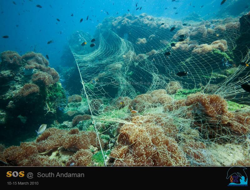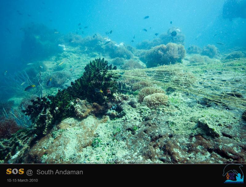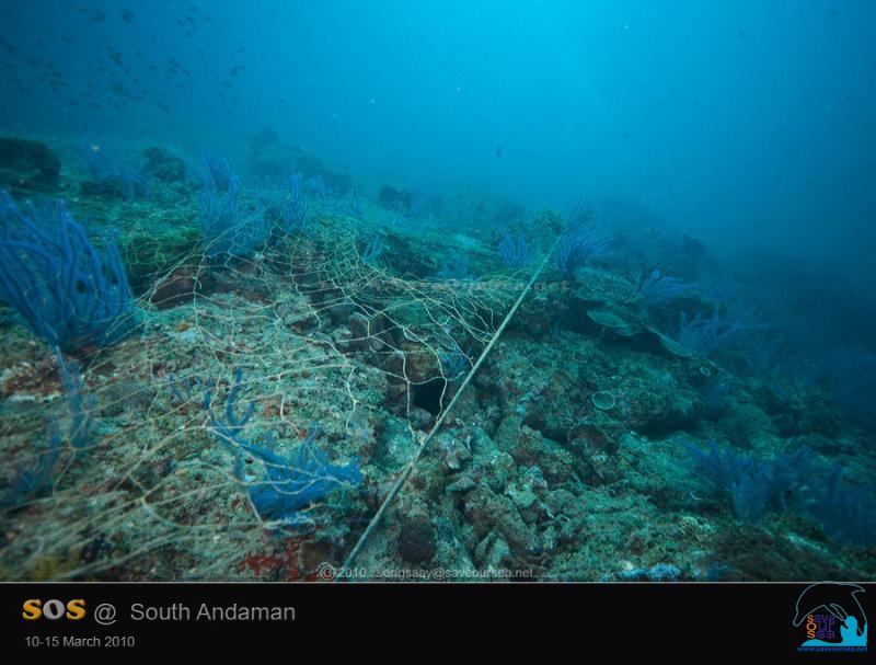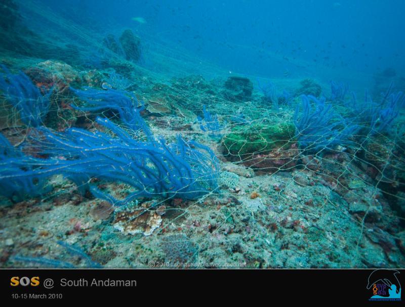 พาดเกี่ยวทั่วไปหมด ทั้งปะการังแข็ง กัลปังหาสีฟ้า ดอกไม้ทะเล ฯลฯ