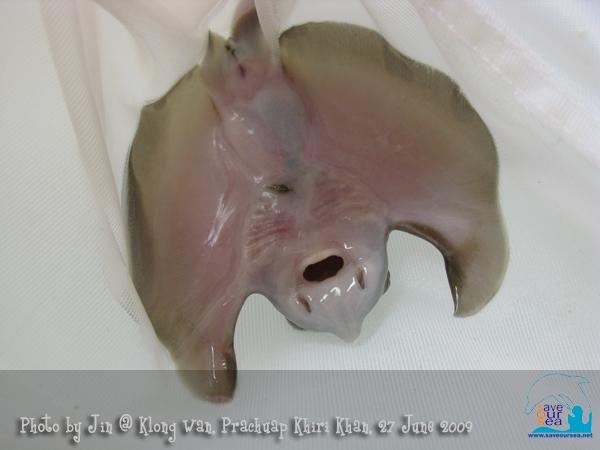 สอบถามได้ความว่า เจ้าตัวน้อยนี่ถูกจับโดยติดอวนมาจากชายฝั่งทะเลประจวบฯ เห็นยังมีชีวิตอยู่ ชาวบ้านที่เจอเลยนำไปมอบให้สำนักงานประมงจังหวัดฯ ทางสำนักงานก็ไม่มีอุปกรณ์การเลี้ยงเลยนำมาส่งให้ศูนย์ประมงฯ ของเราที่คลองวาฬ ตั้งแต่วันที่ 24 มิ.ย. 2552 เจ้าหน้าที่ของเราก็ปล่อยลงเลี้ยงในบ่อซีเมนต์ และลองให้เนื้อปลา (ชิ้นบะเหิ่ม) เป็นอาหาร แต่ดูๆ แล้วมันคงไม่กินหรอกค่ะ เห็นแต่ชิ้นเนื้อปลายังคงอยู่ในบ่อและเริ่มจะเน่า.. เพราะปลากระเบนโดยทั่วไปน่าจะหากินกุ้งหอยหรือสัตว์ทะเลเล็กๆ ที่อาศัยในพื้นทรายมากกว่ากินเนื้อปลา