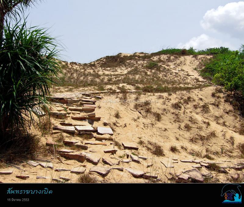 เห็นสภาพทางเดินที่เป็นแผ่นหินเรียงไว้ ดูระเกะระกะหาเป็นทางเดินไม่ ประกอบกับตอนที่ไปถึง เป็นช่วงใกล้เที่ยงที่แดดแผดเปรี้ยง สองสายเลยเลี่ยงที่จะเดินไปตามทางเดิน ที่เขาเตรียมไว้ให้เดินที่มีทรายร้อนฉ่า แต่เลี่ยงไปเดินในป่าสน ที่ใบสนตกลงมาคลุมทรายหนา ซึ่งเดินได้สบายเท้าและมีร่มเงาบังแดด ทำให้ไม่ร้อนจัดแทน...