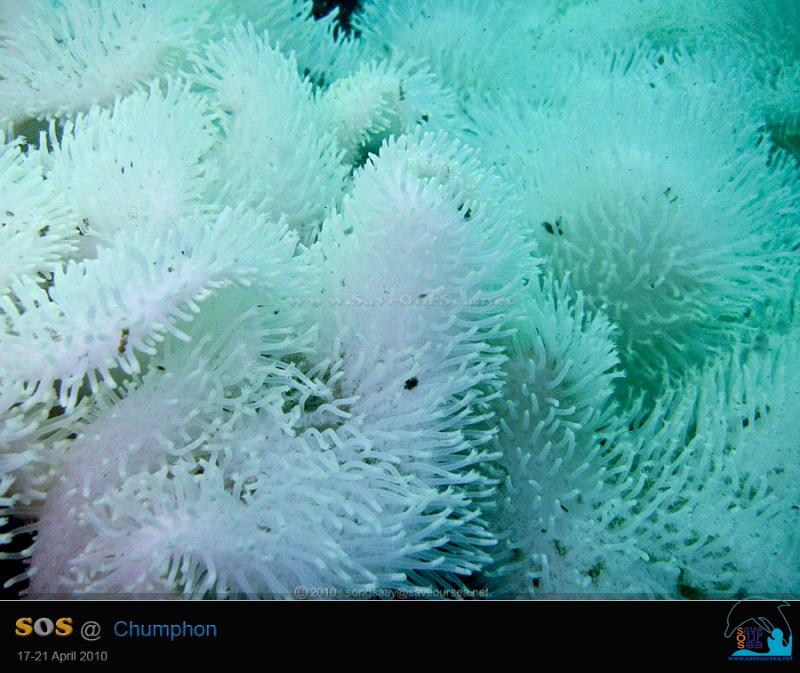 ขอแปะมือมาโพสต์ช่วงปิดทริปแทนคุณสายชลครับ .... จาก SOS Pinnacle I ... เราตั้งใจจะไปดำไดฟ์สุดท้ายที่เกาะหลักง่าม แต่ธรรมชาติไม่เป็นใจ ลมเกิดแรงขึ้นมาเสียเฉยๆ จนกัปตันชัยต้องเปลี่ยนแผนนำเรือเข้าไปหลบคลื่นและลมที่เกาะง่ามใหญ่ และในเมื่อไปไหนไม่ไหวแล้ว เราจึงต้องดำปิดทริปกันที่เกาะง่ามใหญ่ ด้านตะวันออก เกาะง่ามใหญ่ เดิมจะมีปะการังหนังปกคลุมก้อนหินเต็มไปหมด แต่หลังจากที่พายุเกย์พัดเข้าถล่มชุมพร เกาะง่ามใหญ่ถูกแรงคลื่นและกระแสน้ำโหมเข้ากระแทกอย่างรุนแรง จนปะการังหนังหลุดลอยหายไปเกือบหมด เหลือแต่กองหินเปล่าๆไว้ให้ดูเท่านั้น เป็นเวลานานมากที่สองสายไม่ได้มาดำที่ด้านนี้ของเกาะง่ามใหญ่ จึงเป็นโอกาสดีที่จะลงไปสำรวจดูเสียหน่อยว่า ปะการังหนังหนาแน่นขึ้นหรือไม่ แต่ ... ยังไม่ทันเห็นปะการังหนัง ก็ต้องพบภาพสะเทือนใจเสียแล้ว บรรดาดอกไม้ทะเล (Sea Anemones) บนกองหินเริ่มเปลี่ยนสี บางตัวกลายเป็นสีขาวไปเรียบร้อยแล้วด้วย