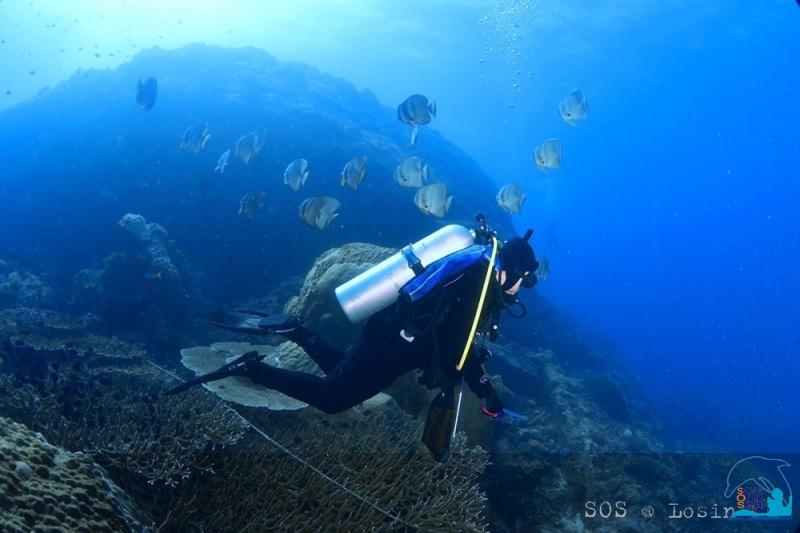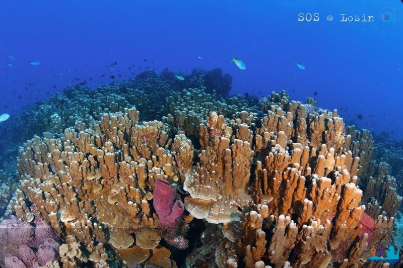 กองหินจม เกาะโลซิน คลื่นลมที่แรงขึ้นในเย็นวันแรกที่โลซิน ทำให้คลื่นลมแรง ในคืนนั้น เราจึงนอนอยู่ในเรือที่เหมือนชิงช้าที่แกว่งไปมา และในเช้าวันรุ่งขึ้น แผนการที่เราจะลงดำน้ำโดยการกระโดดลงเหนือกองหินจม จึงจำต้องเปลี่ยนมากระโดดน้ำลงทางด้านตะวันตกเฉียงใต้ของกองหินกระโจมไฟ แล้วว่ายให้กระแสน้ำพาเราไหลไปยังกองหินจมแทน สภาพใต้น้ำระหว่างเกาะกระโจมไฟและกองหินจม มีสภาพที่เปลี่ยนไป ปะการังหนังที่เคยขึ้นอยู่หนาแน่นหายไปเกือบหมด แต่ปะการังแข็งยังคงสวยงามและอุดมสมบูรณ์ดี