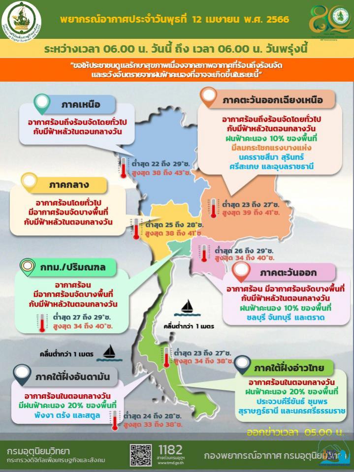 สภาวะอากาศทั่วไป ประเทศไทยมีอากาศร้อนโดยทั่วไปกับมีฟ้าหลัวในตอนกลางวัน และมีอากาศร้อนจัดบางพื้นที่ในภาคเหนือ ภาคตะวันออกเฉียงเหนือ ภาคกลาง รวมทั้งกรุงเทพมหานครและปริมณฑล และภาคตะวันออก ทั้งนี้เนื่องจากบริเวณความกดอากาศต่ำเนื่องจากความร้อนปกคลุมประเทศไทยตอนบน ในขณะที่ลมใต้พัดปกคลุมภาคตะวันออกเฉียงเหนือตอนล่าง ภาคกลางตอนล่าง และภาคตะวันออก ทำให้ภาคตะวันออกเฉียงเหนือ และภาคตะวันออก มีฝนฟ้าคะนองบางแห่ง จึงขอให้ประชาชนดูแลรักษาสุขภาพเนื่องจากสภาพอากาศที่ร้อนถึงร้อนจัด และระวังอันตรายจากฝนฟ้าคะนองที่อาจจะเกิดขึ้นในระยะนี้ไว้ด้วย ส่วนลมตะวันตกเฉียงเหนือพัดปกคลุมทะเลอันดามัน และภาคใต้ ทำให้ภาคใต้ยังคงมีฝนฟ้าคะนองเกิดขึ้นได้บางพื้นที่ ฝุ่นละอองในระยะนี้ : ภาคเหนือ ภาคตะวันออกเฉียงเหนือ และภาคกลางตอนบนมีการสะสมของฝุ่นละออง/หมอกควันอยู่ในเกณฑ์ปานกลางถึงมากเนื่องจากการระบายอากาศไม่ดี ส่วนภาคกลางตอนล่าง รวมทั้งกรุงเทพมหานครและปริมณฑล ภาคตะวันออก และภาคใต้ยังคงมีการสะสมน้อย เนื่องจากการระบายอากาศในบริเวณดังกล่าวยังคงอยู่ในเกณฑ์ดี กรุงเทพมหานครและปริมณฑล อากาศร้อนกับมีฟ้าหลัวในตอนกลางวัน และมีอากาศร้อนจัดบางพื้นที่ อุณหภูมิต่ำสุด 27-29 องศาเซลเซียส อุณหภูมิสูงสุด 34-40 องศาเซลเซียส ลมใต้ ความเร็ว 10-20 กม./ชม. คาดหมาย ในช่วงวันที่ 12 ? 14 และ 17 เม.ย. 66 ความกดอากาศต่ำเนื่องจากความร้อนปกคลุมประเทศไทยตอนบน ทำให้ประเทศไทยตอนบนมีอากาศร้อนโดยทั่วไปกับมีฟ้าหลัวในตอนกลางวันและมีอากาศร้อนจัดบางพื้นที่ ในขณะที่ลมใต้พัดปกคลุมภาคตะวันออกเฉียงเหนือตอนล่าง และภาคตะวันออก ลักษณะเช่นนี้ทำให้ประเทศไทยตอนบนมีฝนฟ้าคะนองกับมีลมกระโชกแรงเกิดขึ้นบางพื้นที่ สำหรับลมตะวันออกกำลังอ่อนพัดปกคลุมอ่าวไทย ภาคใต้ และทะเลอันดามัน ทำให้ภาคใต้มีฝนน้อย โดยมีฝนฟ้าคะนองบางแห่ง ส่วนในช่วงวันที่ 15 - 16 เม.ย. 66 บริเวณความกดอากาศสูงหรือมวลอากาศเย็นกำลังปานกลางจากประเทศจีนจะแผ่ลงมาปกคลุมภาคตะวันออกเฉียงเหนือ และทะเลจีนใต้ ส่งผลทำให้ลมใต้และลมตะวันออกเฉียงใต้ที่พัดนำความชื้นจากทะเลจีนใต้และอ่าวไทยเข้ามาปกคลุมประเทศไทยตอนบนมีกำลังแรงขึ้น ในขณะที่บริเวณประเทศไทยตอนบนมีอากาศร้อนถึงร้อนจัด ลักษณะเช่นนี้จะทำให้ประเทศไทยตอนบนมีพายุฤดูร้อนเกิดขึ้น โดยมีลักษณะของพายุฝนฟ้าคะนอง ลมกระโชกแรง และลูกเห็บตกบางแห่ง รวมถึงอาจมีฟ้าผ่าเกิดขึ้นได้บางพื้นที่ โดยจะเริ่มมีผลกระทบในภาคตะวันออกเฉียงเหนือตอนบนก่อน ส่วนภ