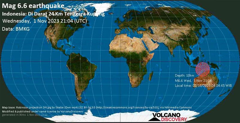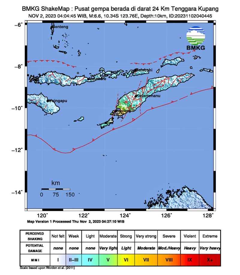 แผ่นดินไหว 6.1 เขย่าเกาะติมอร์ อินโดฯ ผวาบ้านเรือนพังยับ-ประชาชนแห่หนีตาย ![]() แผ่นดินไหว 6.1 ? เอเอฟพีและ สเตรตส์ไทมส์ รายงานวันที่ 2 พ.ย. ว่า สำนักสำรวจธรณีวิทยาสหรัฐอเมริการะบุว่า เกิด แผ่นดินไหว ขนาด 6.1 แม็กนิจูด เมื่อเวลาราว 04.04 น. ตามเวลาท้องถิ่นอินโดนีเซียตะวันตก มีจุดศูนย์กลางห่างจากเมืองกูปัง เมืองหลักของจังหวัดนูซาเติงการาตะวันออก บนเกาะติมอร์ ของ อินโดนีเซีย ไปทางตะวันออกเฉียงเหนือราว 21 กิโลเมตร และอยู่ลึกลงไป 36.1 กิโลเมตร ขณะที่สำนักงานธรณีฟิสิกส์อินโดนีเซีย (บีเอ็มเคจี) ระบุว่าแผ่นดินไหวมีความรุนแรง 6.6 แม็กนิจูด และแรงสั่นสะเทือนรับรู้ได้ไกลถึงติมอร์-เลสเตหรือติมอร์ตะวันออก ![]() เบื้องต้นยังไม่มีรายงานผู้เสียชีวิต แต่พบว่าอาคารบ้านเรือนในพื้นที่ประสบภัยได้รับความเสียหายเป็นบริเวณกว้าง และประชาชนจำนวนหนึ่งอพยพหนีตาย ทั้งนี้ อินโดนีเซียเป็นหนึ่งในประเทศที่เผชิญหน้ากับแผ่นดินไหวบ่อยครั้งเนื่องจากมีภูมิประเทศตั้งอยู่บน ?วงแหวนแห่งไฟ? ในมหาสมุทรแปซิฟิก โดยเมื่อเดือนพ.ย.2565 เกิดแผ่นดินไหวขนาด 5.6 แม็กนิจูดในจังหวัดชวาตะวันตกซึ่งเป็นเกาะหลักของประเทศ และมีผู้เสียชีวิตมากถึง 602 ราย แผ่นดินไหว 6.1 เขย่าเกาะติมอร์ อินโดฯ ผวาบ้านเรือนพังยับ-ชาวบ้านแห่อพยพ ![]() Indonesia?s geophysics agency, or BMKG, said the quake had a higher magnitude of 6.6. The tremor was strongly felt in Kupang on the island split between Indonesian territory in the west and the sovereign state of East Timor in the east, according to an AFP journalist, but no casualties were reported. /Indonesia?s geophysics agency (BMKG)/ ![]() แผ่นดินไหว 6.1 ? Debris had fallen from buildings in the city and some residents were forced to evacuate their homes. Indonesia experiences frequent earthquakes due to its position on the Pacific ?Ring of Fire?, an arc of intense seismic activity that stretches from Japan through Southeast Asia and across the Pacific basin. /BMKG/ |