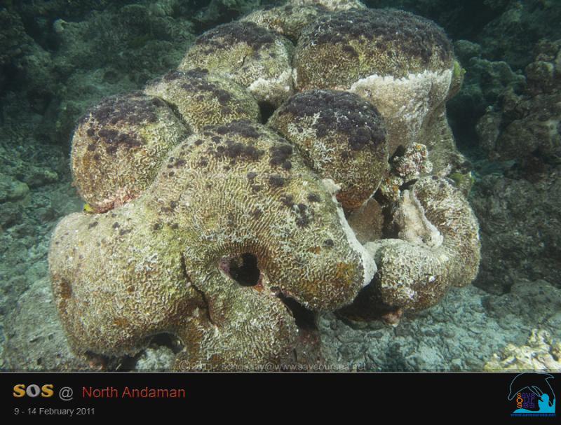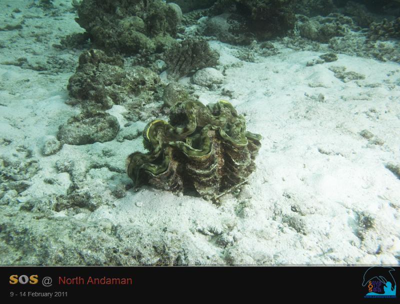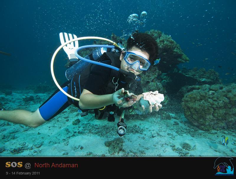 ปะการังมีสภาพจะตายมิตายแหล่อย่างนี้ แล้วหอยมือเสือที่เรานำมาปล่อยจะมีสภาพอย่างไรเล่าคะ.... เราพยายามมองหาหอยมือเสือ....หาเท่าไรก็ยังหาไม่พบ.. มองไปมองมา เห็นแต่เปลือกหอยมือเสือ 2-3 ตัว กะขนาดได้พอๆกับหอยที่เรานำมาปล่อยครั้งแรกเมื่อสองสามปีก่อน....