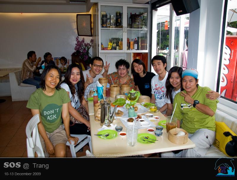 ยังไม่ทันจะไปไหน ... เจอเข้ากับรายการแรก ก็แทบอยากจะกลับไปนอนเสียแล้ว มื้อแรกกับอาหารเช้าของพวกเราที่ "เลตรัง 2" ของคุณแม่จิ๋มกับพ่อกำนันพรศักดิ์ ของน้อง Ploybabe ซึ่งอยู่ห่างสถานีรถไฟไปไม่ไกลนัก ประทับใจสุดๆกับติ่มซำชั้นยอด ที่ต้องซื้อตัวพ่อครัวมาเพื่อผลิตติ่มซำเพียงอย่างเดียว อร่อยคุ้มค่าการลงทุนจริงๆครับ ติ่มซำแต่ละจาน ล้วนเต็มอิ่มไปด้วยเนื้อทั้งนั้น ไม่ว่าจะเป็นหมู ปลา กุ้ง ปู ฯลฯ ที่สำคัญ ต้องขอขอบคุณ "ป๋าหนิ่ง" ที่ออกค่าอาหารมื้อนี้ให้กับพวกเรา แม่จิ๋ม ถ่ายรูปกับพวกเราจนครบทุกโต๊ะ ... ยังกะงานแต่งงานเลย