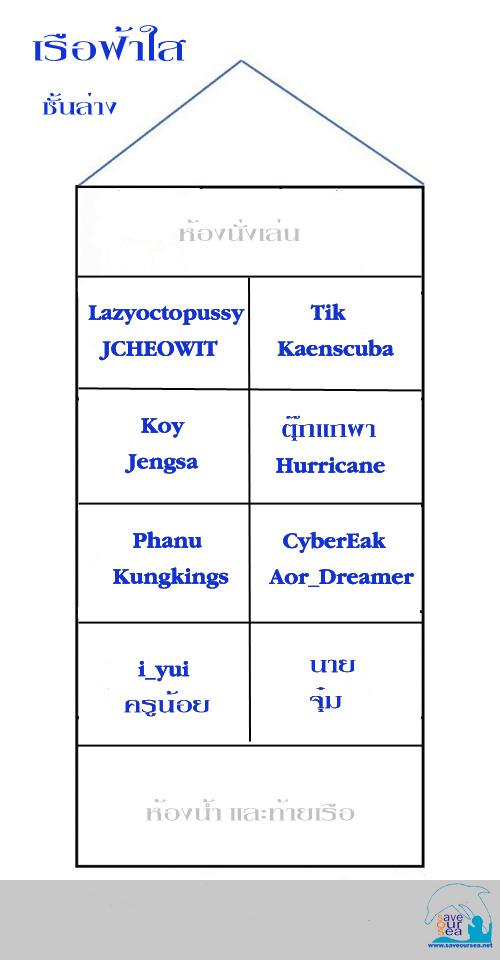 กลุ่มดำน้ำ เป็นดังนี้ ..... กลุ่ม 1 Tik ................... Leader นาย .................. Safety จุ๋ม Film ไอนุ Phanu .............. Safety Kungkings CyberEak Aor_Dreamer กลุ่ม 2 Kaenscuba ........ Leader i_yui ................ Safety ตุ๊กแกผา Hurricane Jengsa Lazyoctopussy JCHEOWIT Udomlert .......... Safety Koy กลุ่ม 3 ครูน้อย ............... Leader หลิด ยุ่น ฝน ................... Safety หนึ่ง สุพัฒน์ ป๊อง piranha Gengzilla สำหรับห้องพัก เป็นดังนี้ครับ