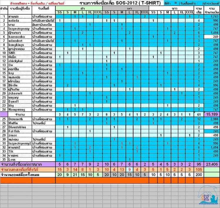 สรุปการรับของ - ผู้ที่ไปทริปอันดามันเหนือและยังไม่ได้รับเสื้อ พี่ๆจะนำเสื้อไปให้ ใครยังไม่ชำระ รบกวนชำระด้วยค่ะ - พีแม่หอย รบกวนแจ้งที่อยู่ให้ด้วยค่ะ และ muffin จะจัดส่งให้อาทิตย์หน้านะค่ะ - ฟ้าคราวน้ำใส โปโลสีดำยังไม่มาส่งและยังไม่ชำระ เลยยังไม่ได้นำมาจัดส่งให้ค่ะ - ส่วนผู้ที่ยังไม่ได้รับเสื้อ รอโปโลสีดำมาก่อนแล้วค่อยรับทีเดียวแล้วกันค่ะ แต่จัดเสื้อคอวี และโปโลสีเทาไว้ตามรายชื่อ(แถบสีฟ้าอ่อน)ไว้ให้เรียบร้อยแล้วค่ะ ขอสรุปยอดรวมล่าสุดดังต่อไปนี้ แก้ไขครั้งสุดท้ายโดย แมลงปอ : 19-01-2012 เมื่อ 08:08 |