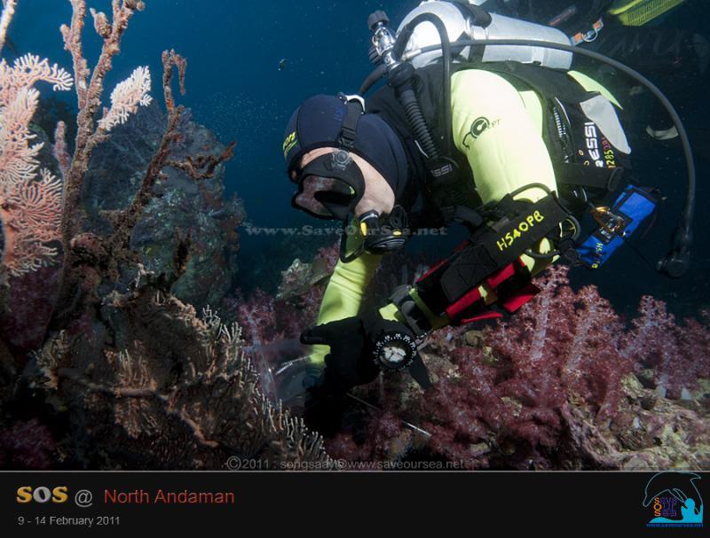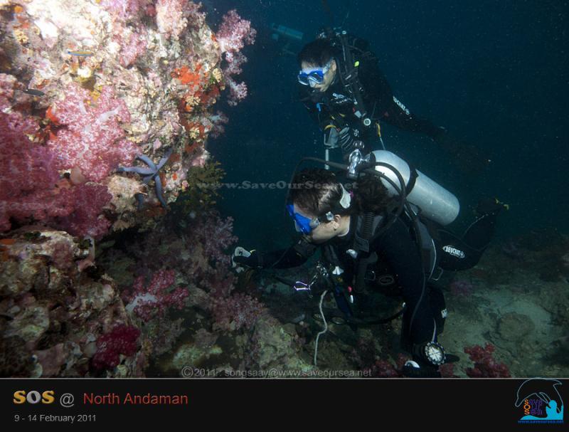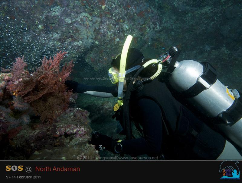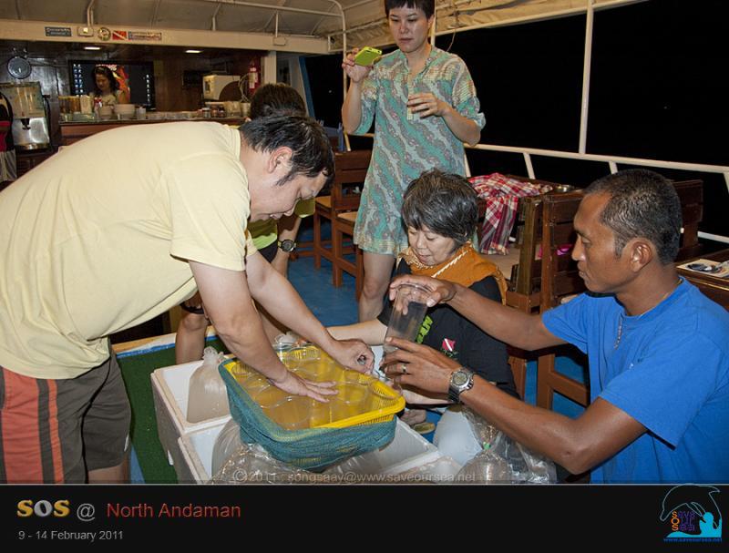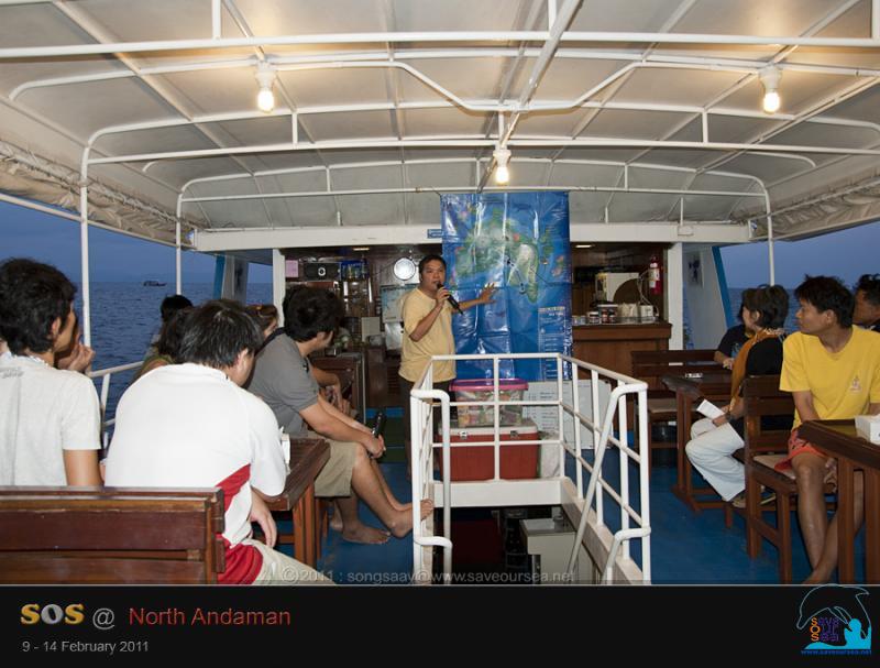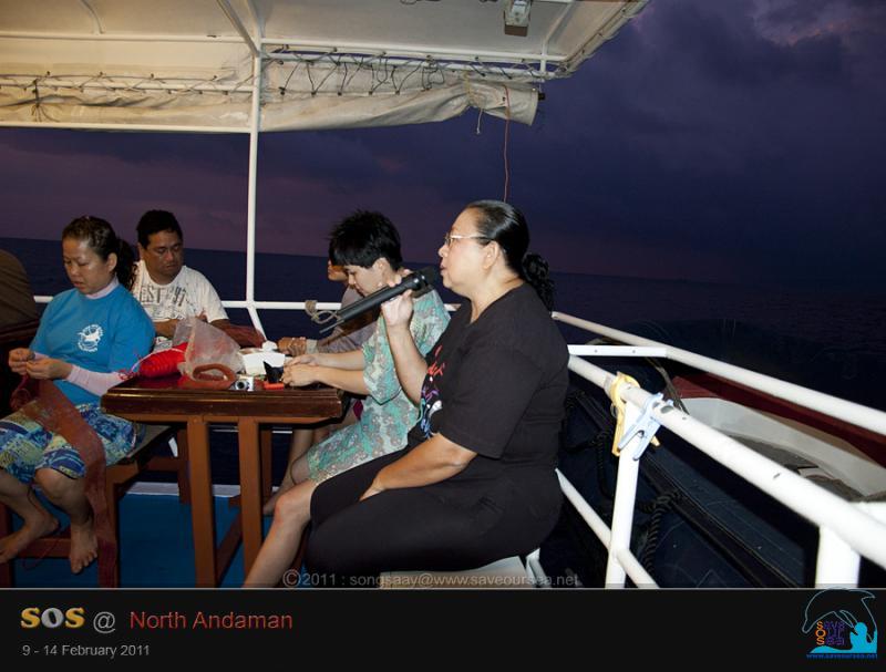 สองสายและอาสมัคร SOS อีก 21 คน ไปลงเรือครบเมื่อเกือบสี่ทุ่ม.... เรือเริ่มเคลื่อนออกจากท่าเรือทับละมุ มุ่งหน้าออกปากอ่าว เสียงจุดประทัดดังปุ้งปั้งแสบแก้วหู นัยว่าเป็นการคารวะและบอกกล่าวแม่ย่านางเรือและเจ้าที่เจ้าทางในบริเวณนั้น ให้ช่วยปกป้องคุ้มครองให้การเดินเรือเป็นไปด้วยความราบรื่น ปลอดภัย ทะเลเรียบเป็นกระจก.....คืนนั้นเรือจึงวิ่งราบเรียบ ก่อนนอน เรามีการแนะนำตัว และ ประชุมร่วมกันเกี่ยวกับกำหนดการปฏิบัติงานในวันรุ่งขึ้น และระเบียบการใช้ชีวิตบนเรือ และการแบ่งกลุ่มดำน้ำ เสร้จแล้ว...ต่างคนต่างแยกย้ายกันไปนอนอย่างสบายในห้องนอนของตัวเอง ตอนตีสี่กว่าๆ เรือก็จอดสนิท ไม่ไกลจากกองหินริเชลิวนัก.... ฟ้ายังมืดอยู่เลยค่ะ แต่พวกเราสมาชิก SOS ก็ตื่นขึ้นมานั่งรอรับแสงอรุณกันตั้งแต่ 6 โมงเช้า เวลาผ่านไปอีกครึ่งชั่วโมง เราก็ขึ้นมานั่งกันครบ หัวหน้า Dive Leader นำโดยน้องกบ Angel Frog น้องติ๊ก และน้องติ่ง ก็เริ่มสรุปถึงเรื่องแผนการดำน้ำทำงานอย่างปลอดภัยตามวิธีของพวกเราชาว SOS โดยมีน้องชาย ตัวแทนที่คุณเสรีส่งมาช่วยดูแลเราอย่างดียิ่ง เป็นผู้ช่วยอธิบายเรื่องจุดดำน้ำ