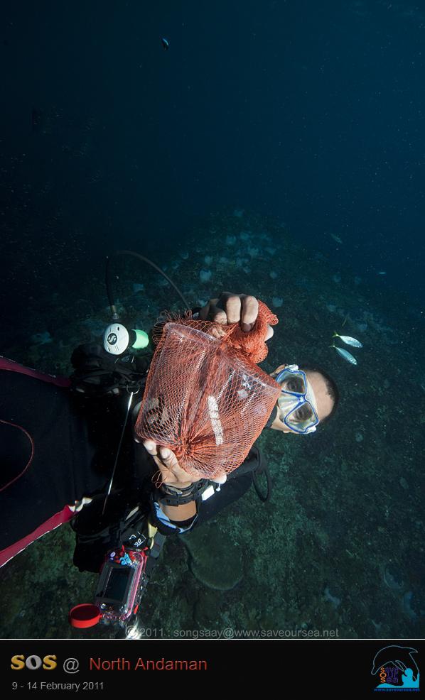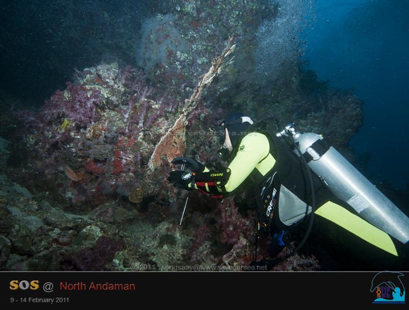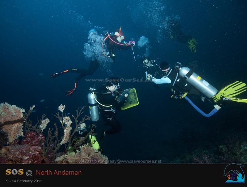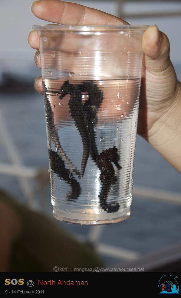 นักดำน้ำ sos กลุ่มน้องติ๊ก ลงน้ำไปก่อนพร้อมสองสายและน้องชาย โดยน้องติ๊กหอบตะกร้าใส่ถ้วยม้าน้ำลงไปด้วย 18 ถ้วย ที่เหลืออีก 2 ถ้วย ให้น้องชายถือลงไป กลุ่มแรกต้องเกาะสายทุ่นรอจนกว่ากลุ่มที่เหลือทะยอยลงน้ำจนครบ เมื่อครบแล้ว สายชลก็พาลัดเลาะตัดไปออกตรงบริเวณที่เราตั้งเป้าหมายที่จะปล่อยม้าน้ำ ซึ่งเต็มไปด้วยกัลปังหาพัด และแส้ทะเล เมื่อถึงที่หมาย....นักดำน้ำลูกทีมทุกคนได้รับแจกถ้วยใส่ม้าน้ำเพื่อนำไปปล่อย....