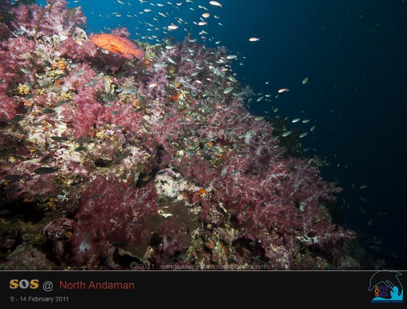 ถึงเวลาลงน้ำกันแล้วค่ะ..... น้ำในเช้าวันนั้น ใสแจ๋วไร้ตะกอน แม้ท้องน้ำจะยังสลัวเลือนลางเพราะแสงแดดยังไม่แรงกล้า เราก็ยังพอจะเห็นความงามใต้ทะเลที่ริเชลิวได้กระจ่างแจ้ง ปะการังอ่อนหลากสีสันขึ้นสลอนอยู่บนกองหิน ปลาตัวเล็กตัวน้อยแหวกว่ายไปมาอยู่ทั่วไป เหมือนกากเพชรที่ถูกโปรยเกลื่อนท้องน้ำ.... ปลาเก๋าจุดฟ้า ปักหลักตั้งป้อมจับลูกปลาตัวเล็กๆเหล่านั้นกินเป็นอาหาร...