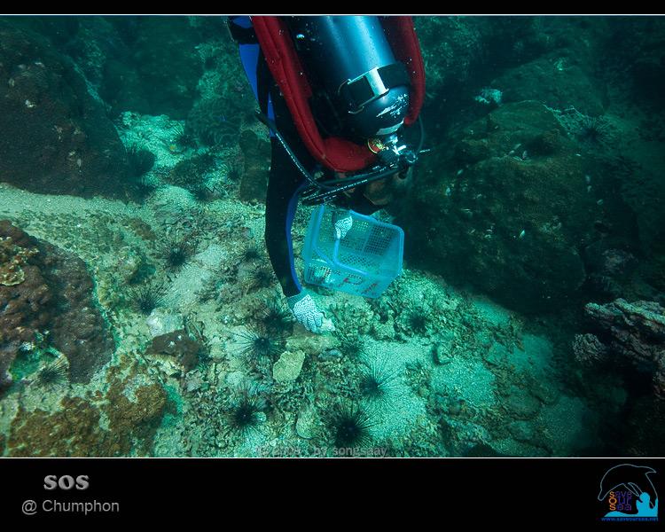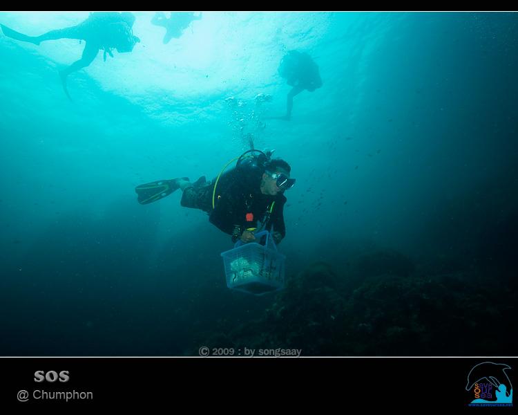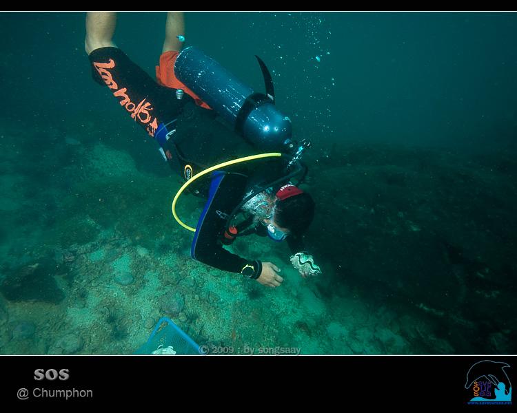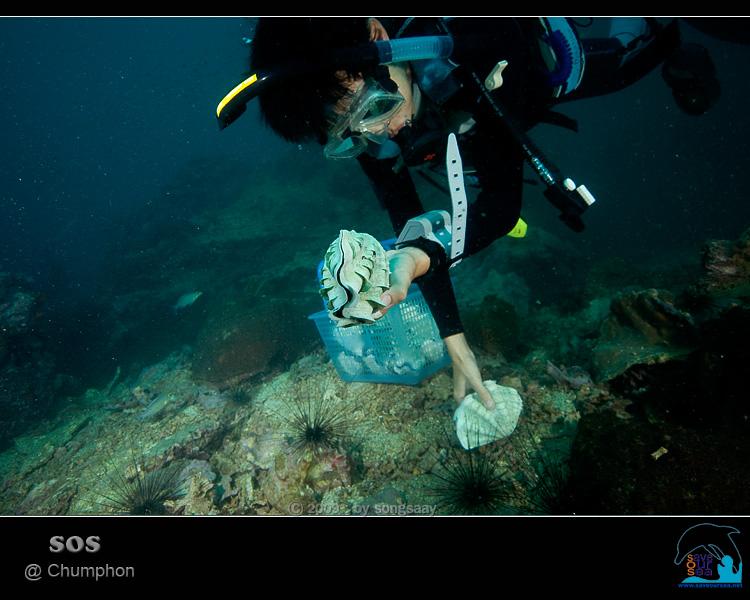 ทันทีที่ Safety Sausage พุ่งขึ้นสู่ผิวน้ำ...พวกเราที่เตรียมตัวพร้อมอยู่แล้วที่ท้ายเรือ ก็เริ่มทยอยกระโดดลงน้ำ ว่ายตรงไปรับตะกร้าใส่น้องหอยฯจากเรือดิ้งกี้ แล้วค่อยๆปล่อยตัวลงสู่ใต้น้ำ....