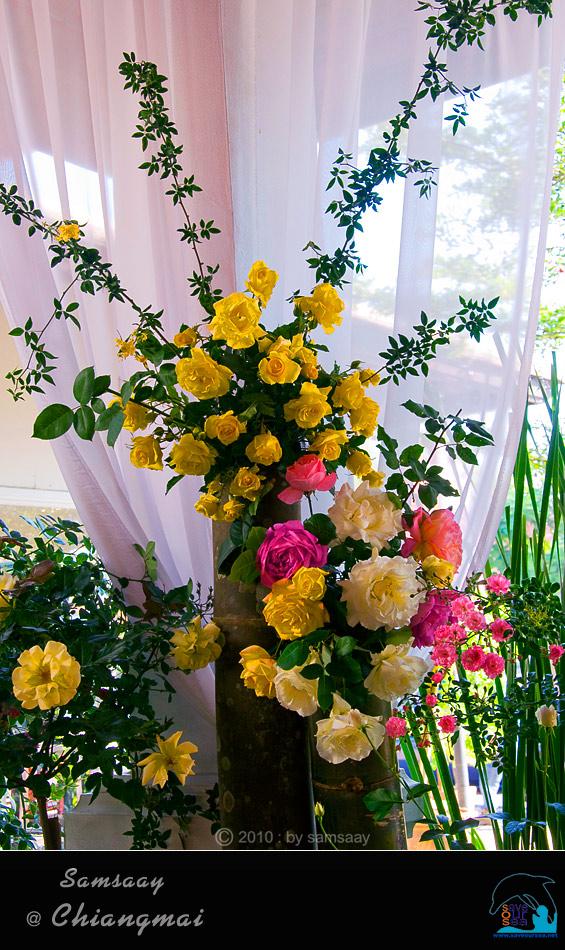 สองวันก่อนงานจะเริ่ม...น้าน้อยและเพื่อนๆกลุ่มผู้(เคย)ปลูกกุหลาบที่น่าเคารพนับถือมาร่วมกันทำงาน ไม่ผิดกับกรรมกร โดยมีสามสายเป็นลูกมือคอยยกต้นไม้ ดอกไม้ แบกโต๊ะ เก้าอี้ กระถาง แจกัน ฯลฯ จนมือเราเยินกันหมดทั้งสามคน งานที่ดูจะทารุณสุด คืองานจัดดอกกุหลาบจากแหล่งปลูกดังๆ (เช่น เชียงใหม่ พบพระ ปากช่อง) ที่จะนำมาใช้จัดตกแต่งสถานที่ลงในถังน้ำยา (น้ำส้ม+น้ำตาล+ไฮเตอร์+น้ำเปล่า) หนามที่แหลมคมทำให้เราได้แผลต็มฝ่ามือ บาดแผลบางจุดมีเลือดพุ่งกระฉูดเป็นน้ำพุ....ทั้งเจ็บทั้งปวดถึงใจจริงๆ