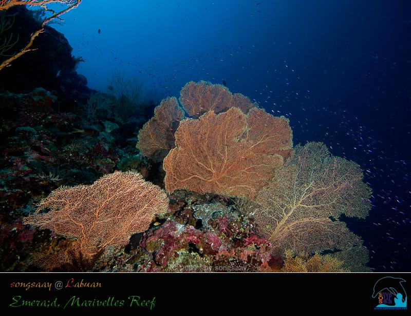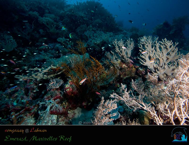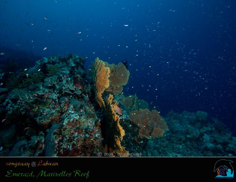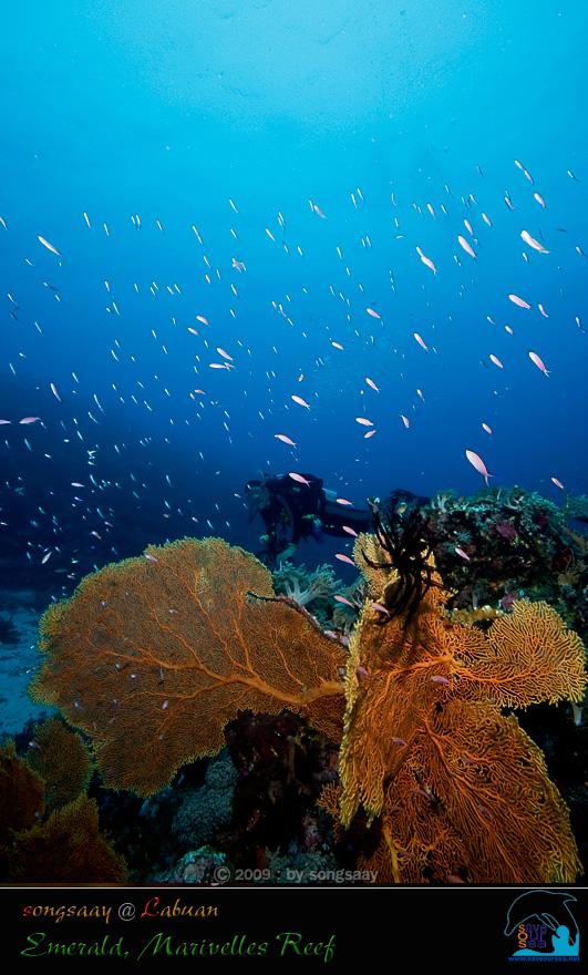 Emerald , Marivelles Reef เรือแล่นไปทางเหนือของ Dallas Reef ไม่นานนัก ก็ถึงจุดดำน้ำอีกแห่งหนึ่ง ที่เรียกว่า Marivelles Reef ซึ่งขึ้นชื่อลือชาว่าสวยและอุดมสมบูรณ์มาก เพื่อที่จะชื่นชมกับความงามนั้นให้ฉ่ำใจ....เราเลยลงดำน้ำที่นี่กันสองไดฟ์ ในไดฟ์แรกมีการวางแผนการดำน้ำโดยให้เราลัดเลาะไปตามหน้าผาสูงที่เต็มไปด้วยกัลปังหาพัด (Gorgonian) ที่สวยงามและหนาแน่น จนทำให้ที่นี่เหมือนกับมรกตเม็ดงามแห่ง Sratly แต่เมื่อกระโดดลงไปในน้ำ.....เราไม่ยักเห็นหน้าผากัลปังหา เห็นแต่ลานทรายที่มีปะการังขึ้นอยู่เป็นหย่อมๆที่ความลึกเกือบ 30 เมตร พวกเราในกลุ่มดิ่งลงไปดำน้ำอยู่เรี่ยๆแถวพื้นทราย ที่มีฉลามครีบขาวว่ายหากินอยู่ 2-3 ตัว