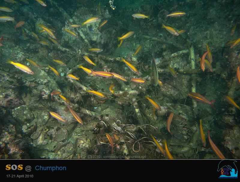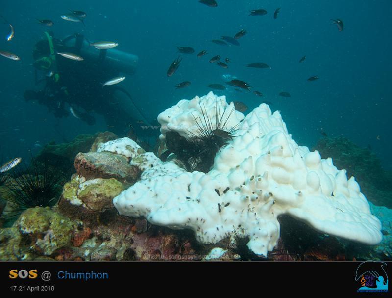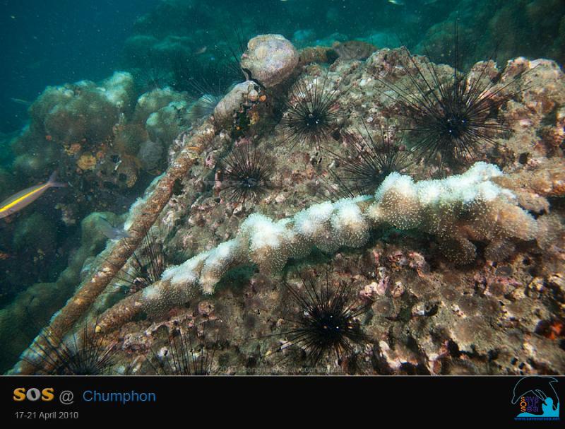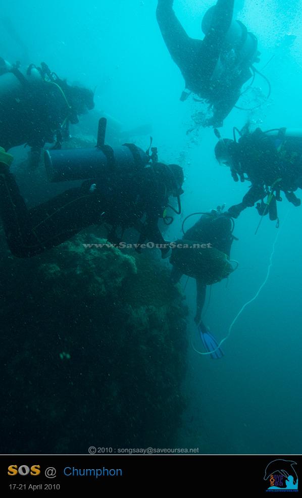 เชือกปากอวนสองเส้นที่อยู่ใกล้ยอดกองหิน มีดอกไม้ทะเลเริ่มมาเกาะ และเริ่มมีการฟอกขาวให้เห็น