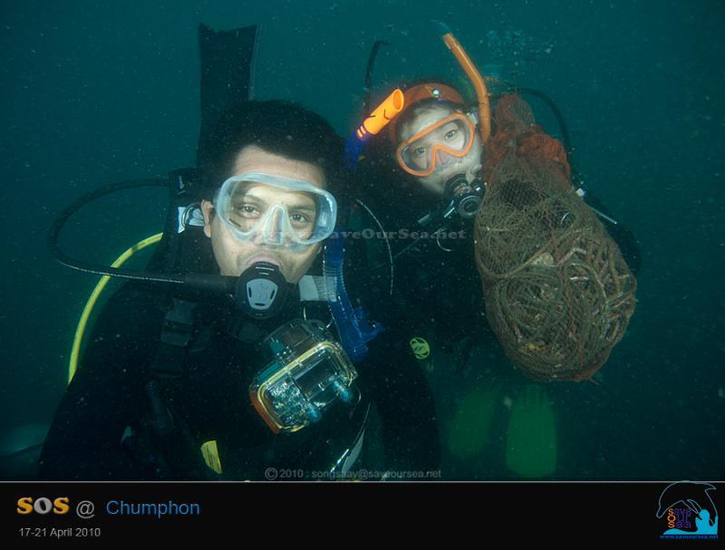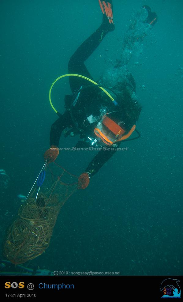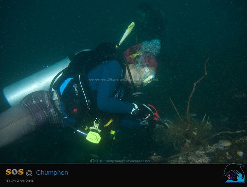 ที่ด้านเหนือของกองหิน....มีเศษอวนพันปะการังอยู่ไม่มากนัก เราจึงได้ภาพการทำงานของพวกเรามาอวดค่ะ.... ก้มหน้าตัด....ตัด...ตัด...