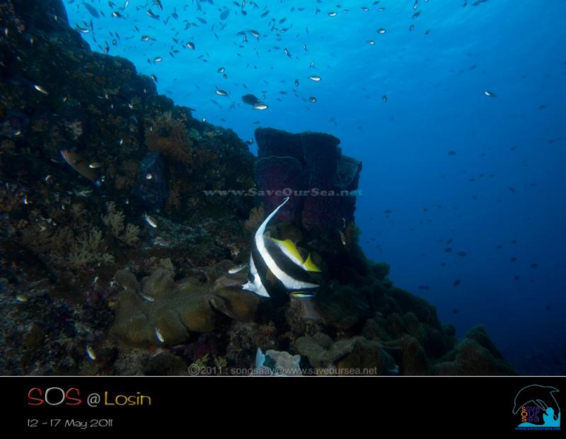 ปลาโนรีครีบยาว (Bannerfish) คู่หนึ่ง ที่ว่ายหากินอยู่ที่กองหินนี้เป็นประจำ ไปกี่ครั้งๆก็ได้พบเสมอ ยังคงว่ายไปว่ายมาให้เห็น